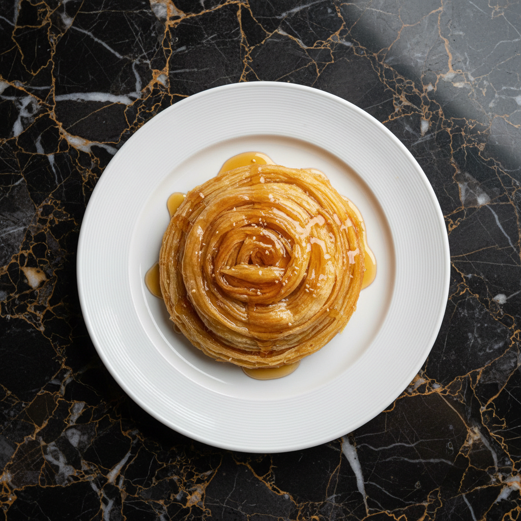 Bint Al Sahn, meaning 'daughter of the plate,' is a beloved Yemeni sweet bread characterized by its numerous thin, flaky layers, rich buttery flavor, and a generous drizzle of honey. Traditionally served for breakfast or as a special treat, it's often enjoyed warm with a cup of tea.