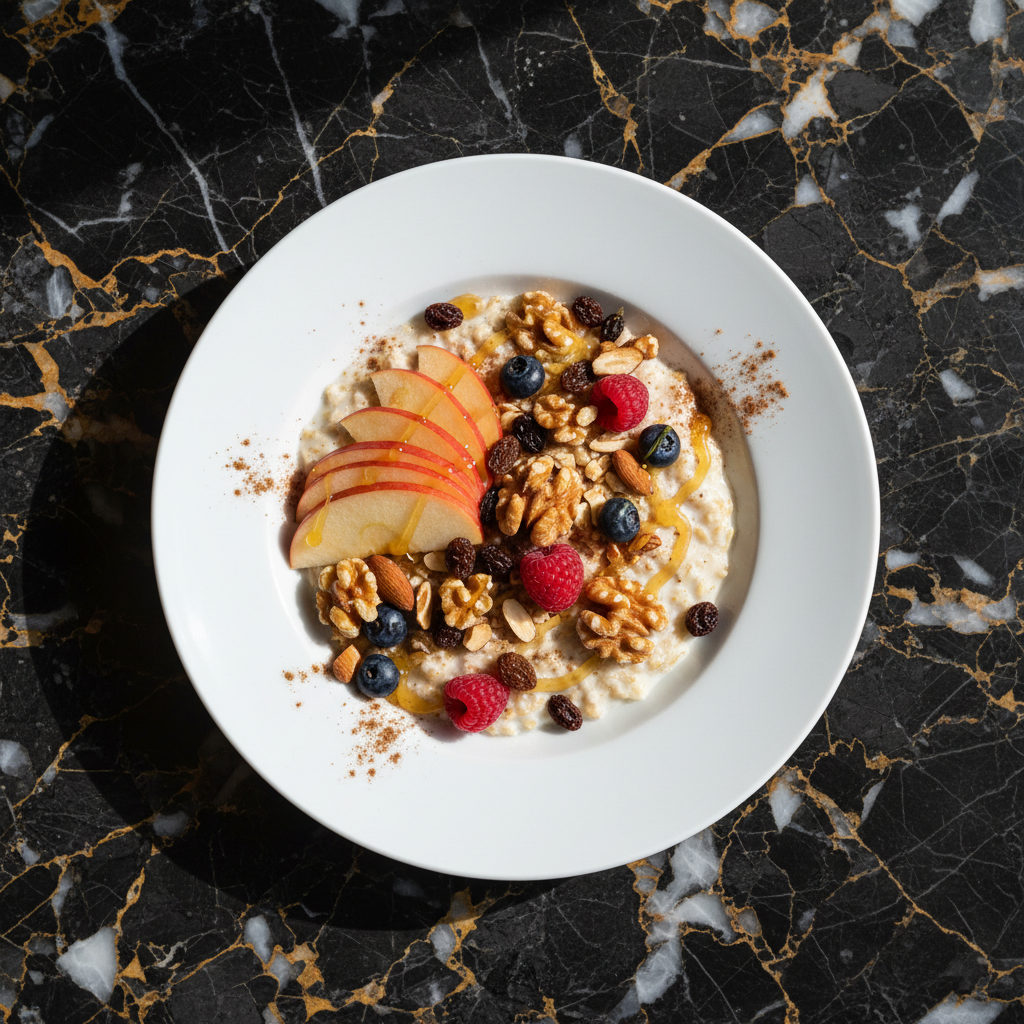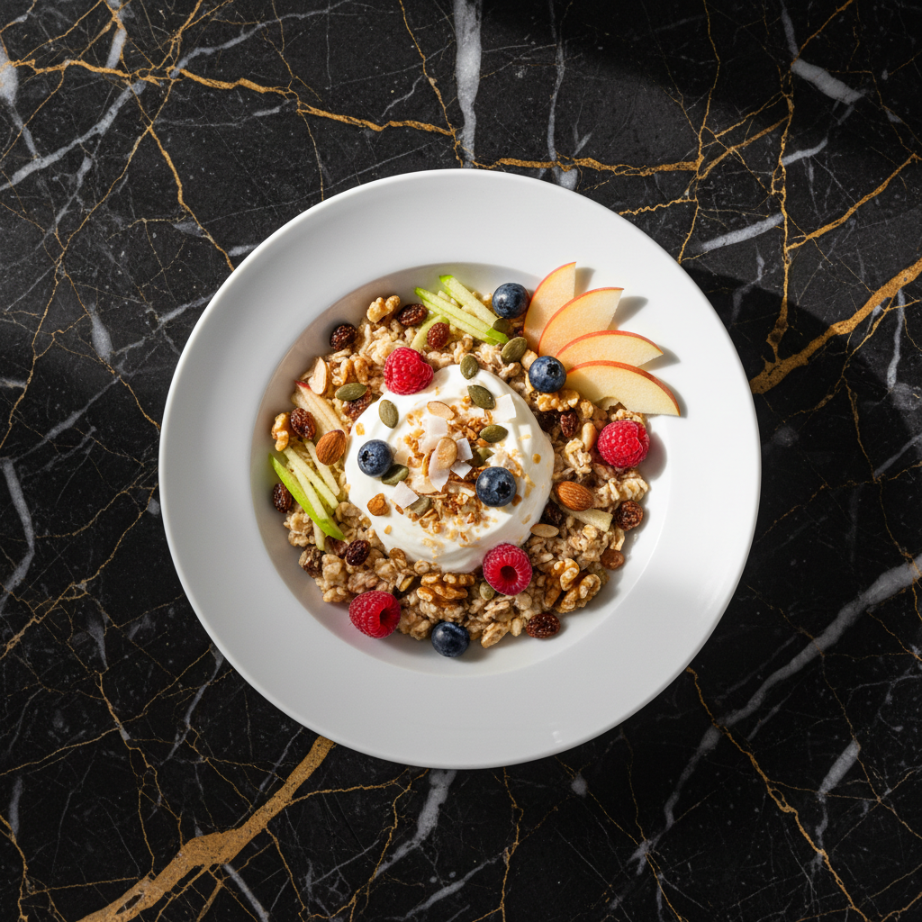 A healthy and hearty breakfast dish invented by Swiss physician Maximilian Bircher-Benner, featuring oats soaked in liquid with fruit and nuts. This version is prepared the night before for a convenient morning meal.