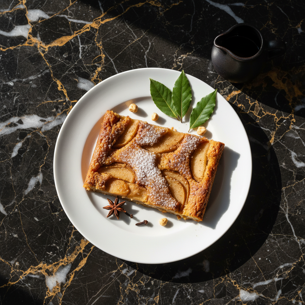 A rustic and comforting pear cake, often baked in a simple rectangular pan. It features tender pears baked into a moist batter, perfect for an afternoon treat with coffee or tea.