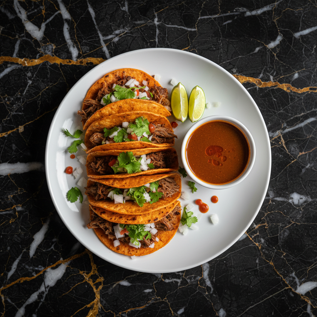 Experience Jalisco's iconic street food: tender, slow-braised beef simmered in a rich, spiced chili broth, then used to fill corn tortillas. The tortillas are dipped in the flavorful rendered beef fat and griddled until perfectly crispy. Served with the fragrant consommรฉ for dipping, these tacos are a culinary delight.
