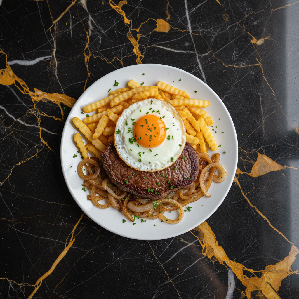 A hearty and satisfying Chilean classic, 'Bistec a lo Pobre' translates to 'poor man's steak.' It features a pan-fried steak served atop a generous portion of french fries, caramelized onions, and topped with a fried egg. It's a comforting and flavorful dish.