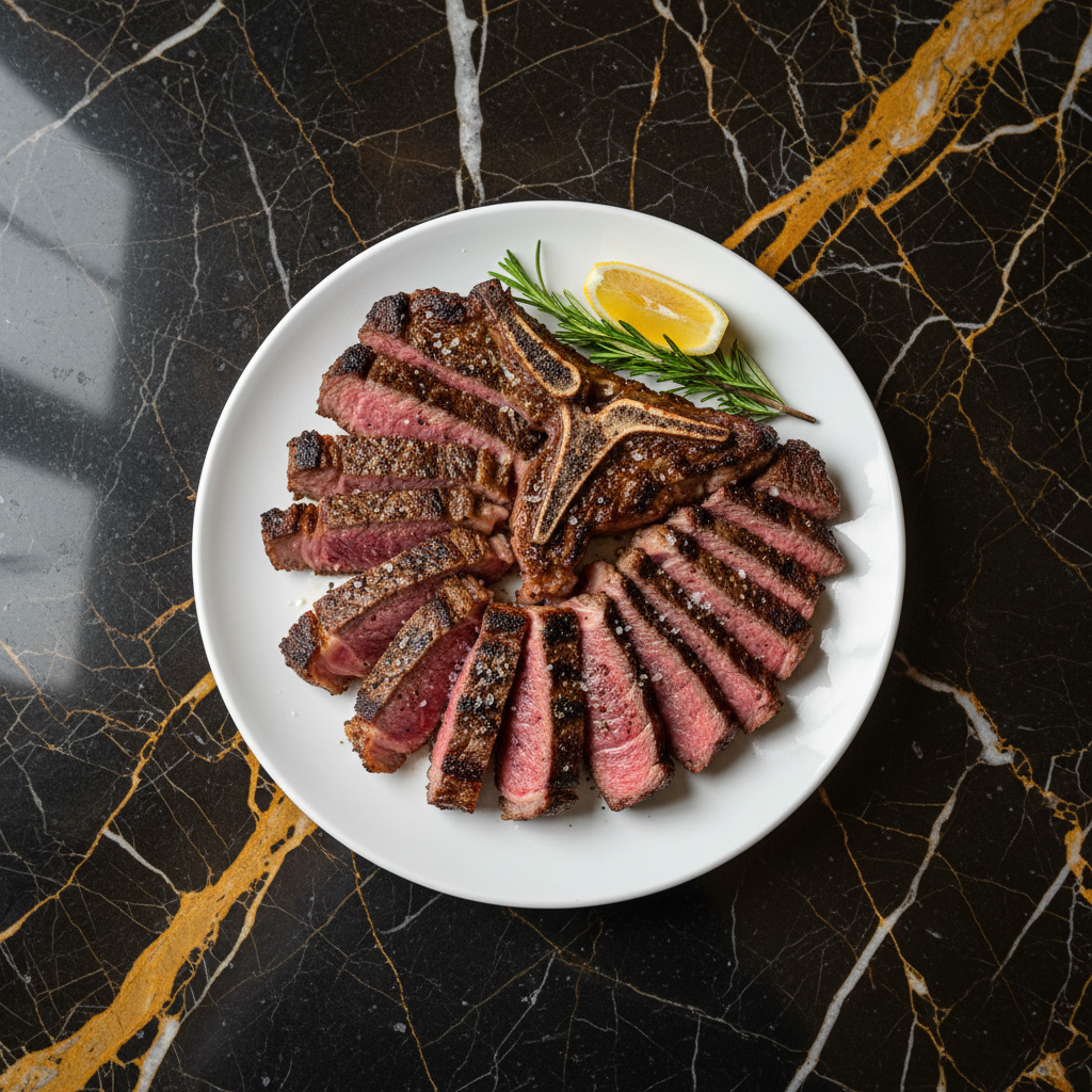 An iconic, thick-cut T-bone steak, traditionally from Chianina beef, grilled to perfection with a rare interior and a beautifully seared crust. Simple seasoning highlights the exceptional quality of the meat.