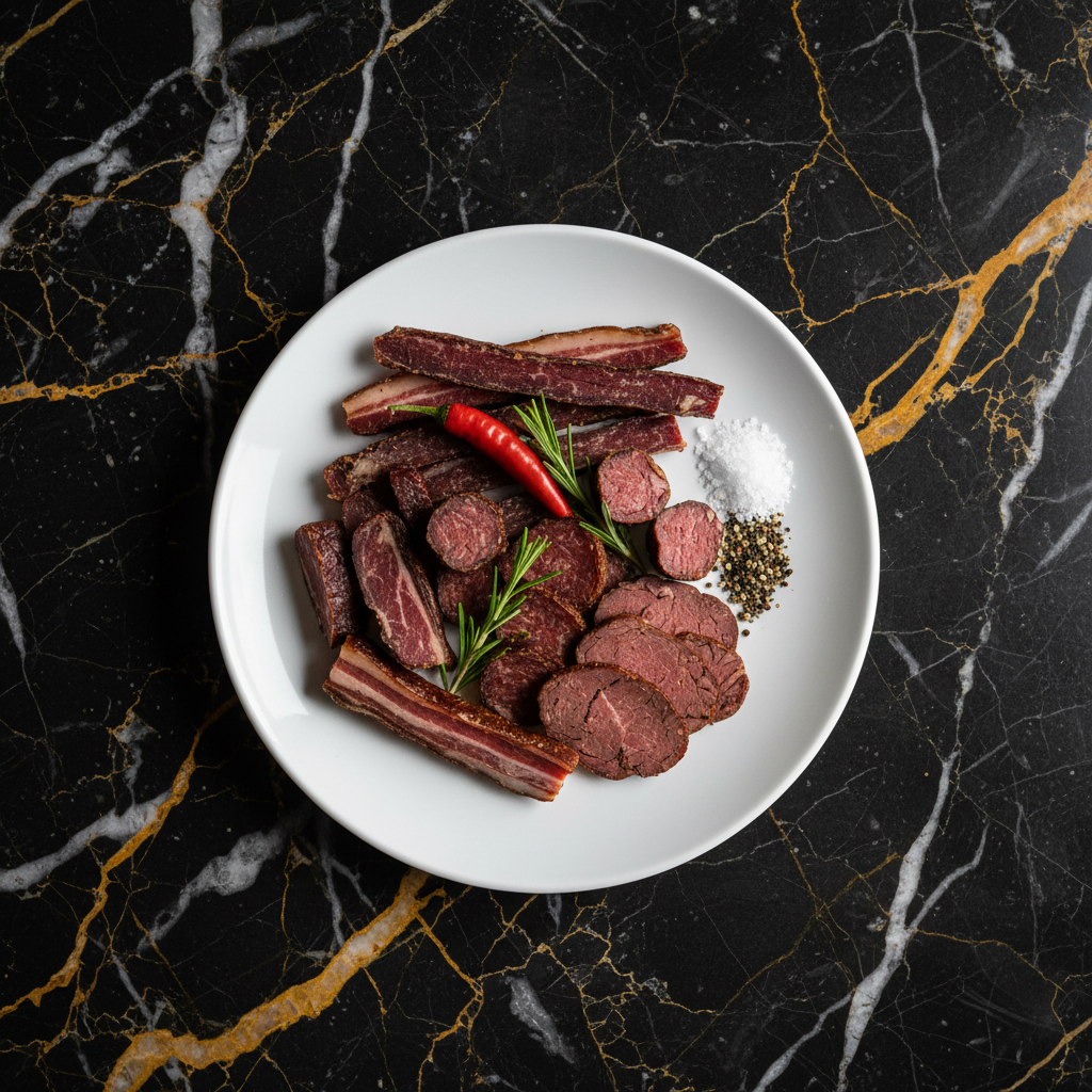 Biltong is a traditional South African dried, cured meat, similar to jerky but with a distinct flavor and texture. It's typically made from beef or game, marinated in a vinegar-based brine, coated in a spiced mixture, and then air-dried.