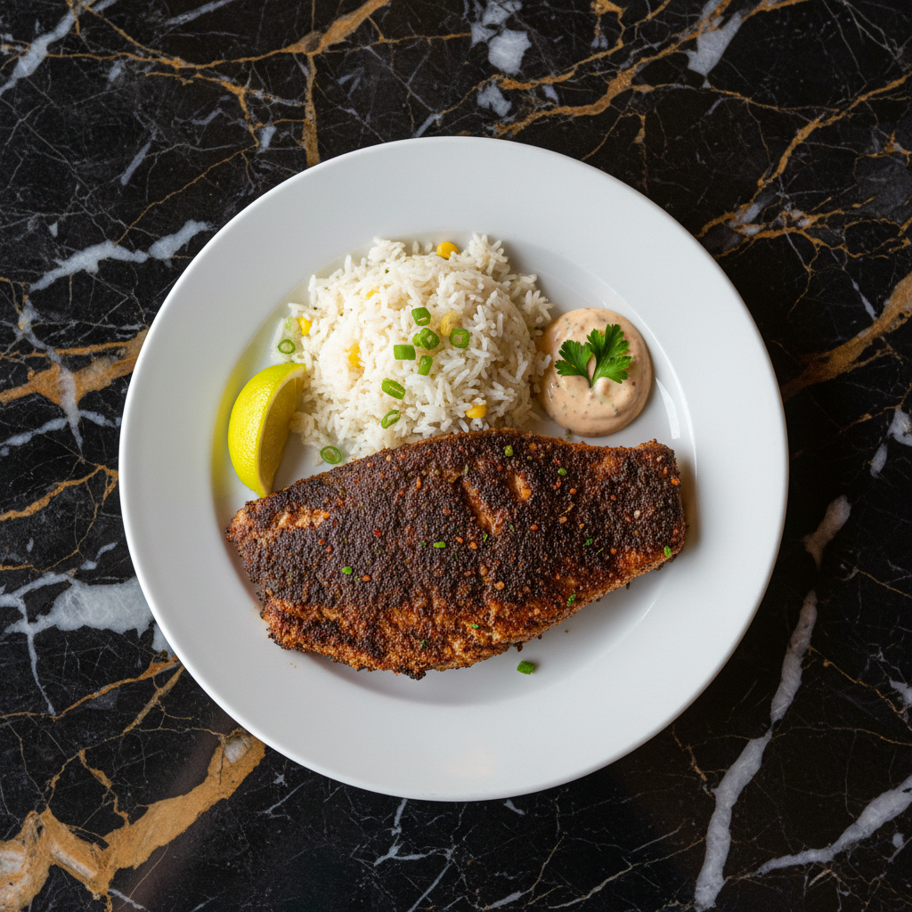This iconic Cajun dish, popularized by Chef Paul Prudhomme, features redfish fillets coated in a bold spice blend and seared in an extremely hot cast-iron skillet until a dark, flavorful crust forms. The high heat and butter create a signature smoky, blackened finish.