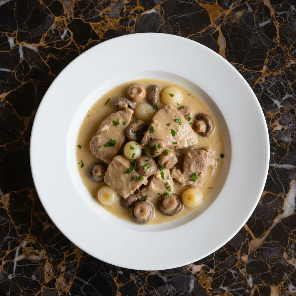 A classic French veal stew featuring incredibly tender veal in a rich, creamy white sauce, studded with sweet pearl onions and earthy mushrooms. This is comfort food at its finest, reminiscent of cherished family recipes.