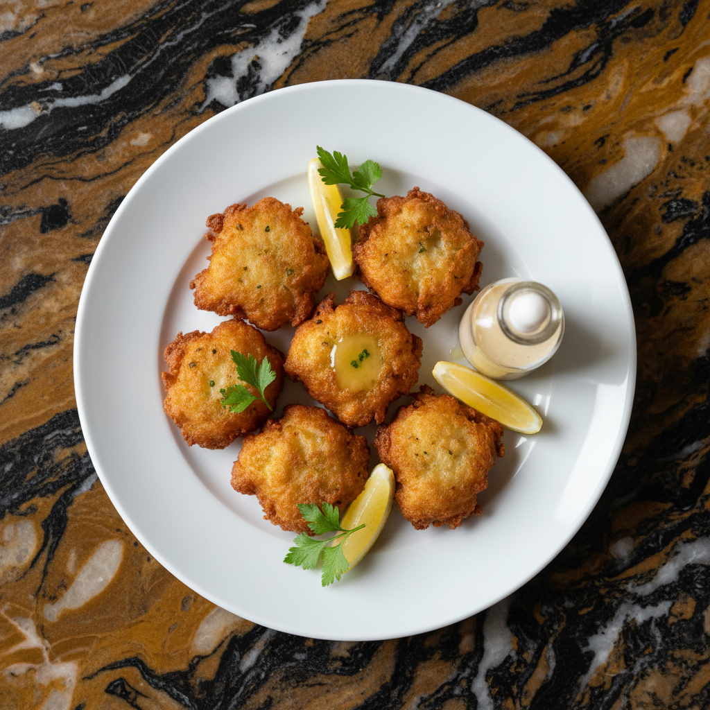 A savory fritter showcasing the prized Bluff oyster, a delicacy from the southern coast of New Zealand. These fritters are crispy on the outside with a tender, briny oyster filling, often served with a squeeze of lemon.