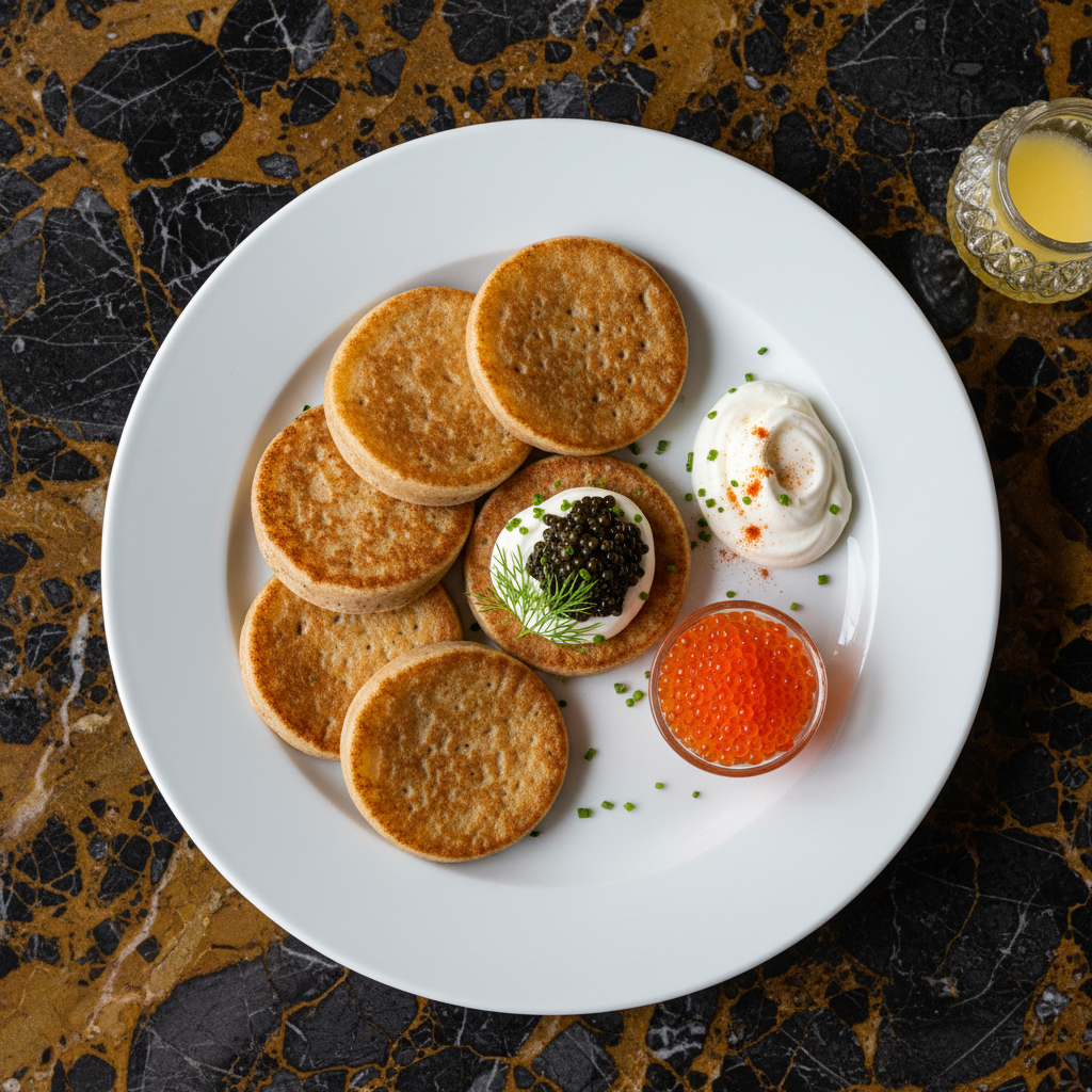 Traditional Russian yeasted buckwheat pancakes, known for their delicate texture and slightly nutty flavor. Perfect for festive occasions and best served with classic accompaniments like caviar, smoked salmon, or sour cream.