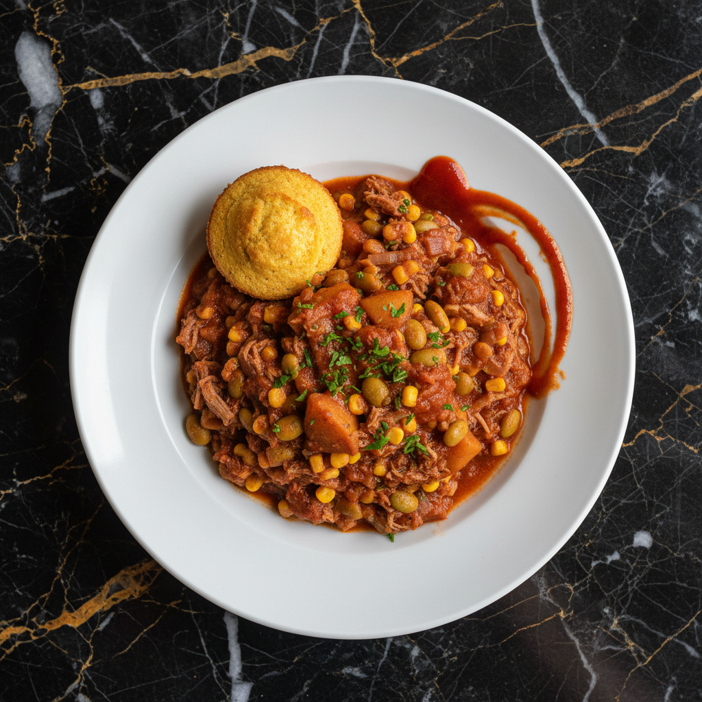 A hearty and flavorful tomato-based stew featuring tender pulled pork and a medley of vegetables, traditionally served as a quintessential Southern BBQ side dish.