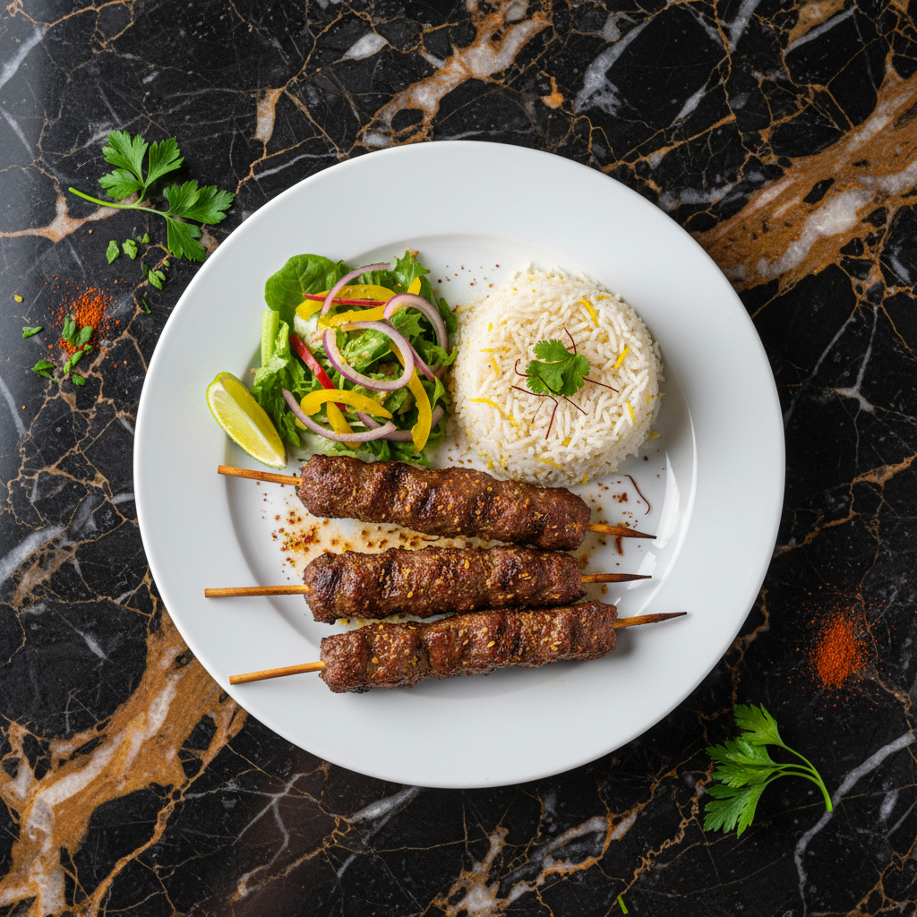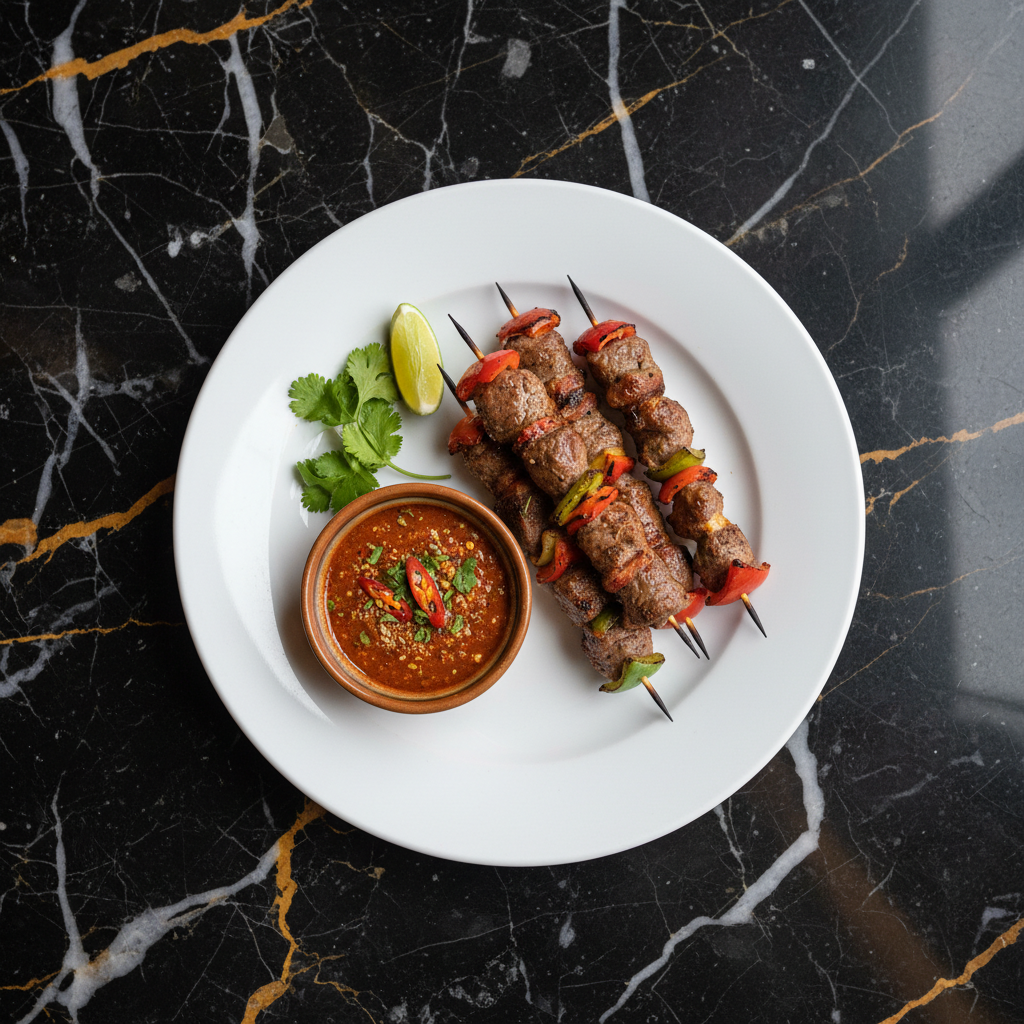 Marinated and grilled skewers of tender lamb or mutton, served with a vibrant, spicy dipping sauce that balances heat with aromatic herbs and spices.