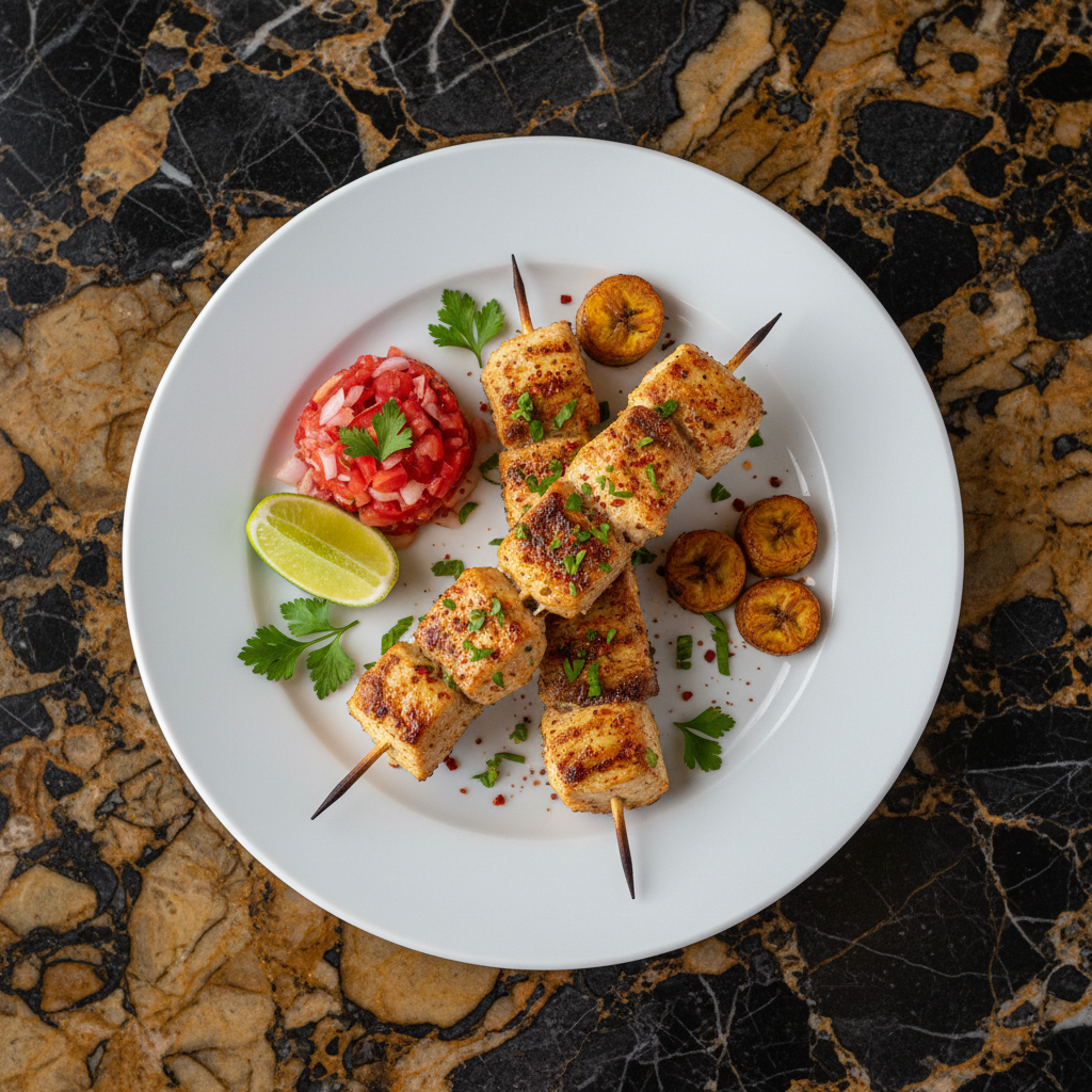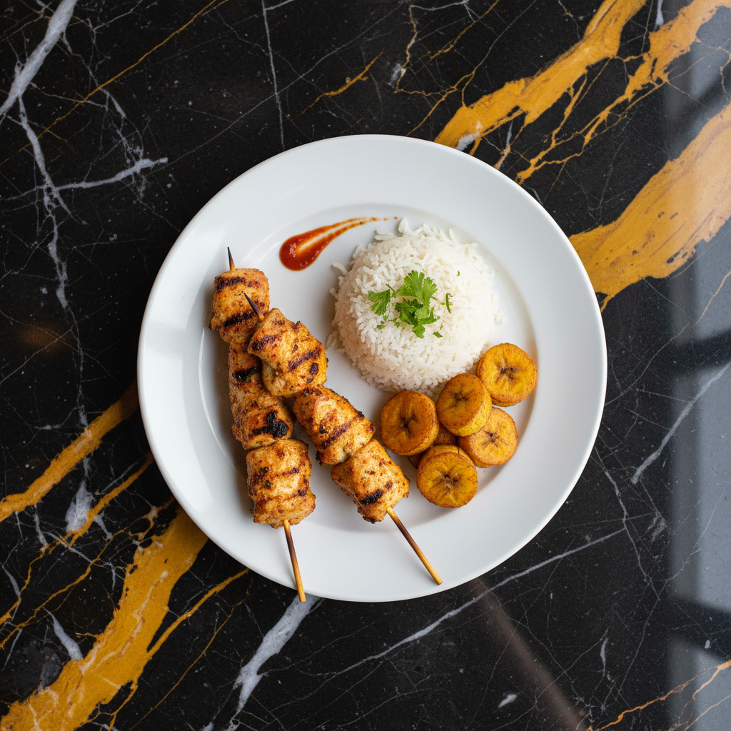 Tender chicken skewers marinated in a flavorful blend of Rwandan spices and grilled to perfection, often served with a side of plantains or rice.
