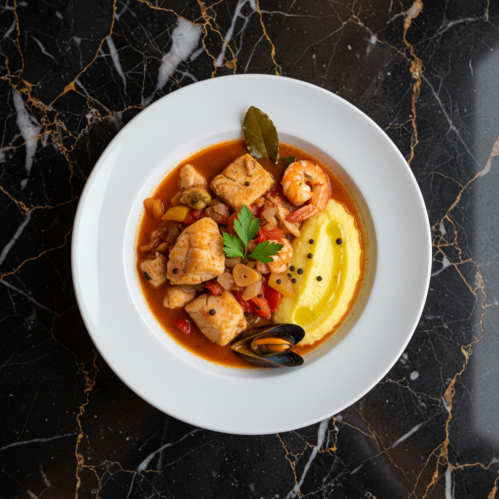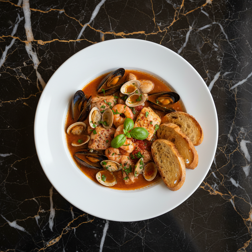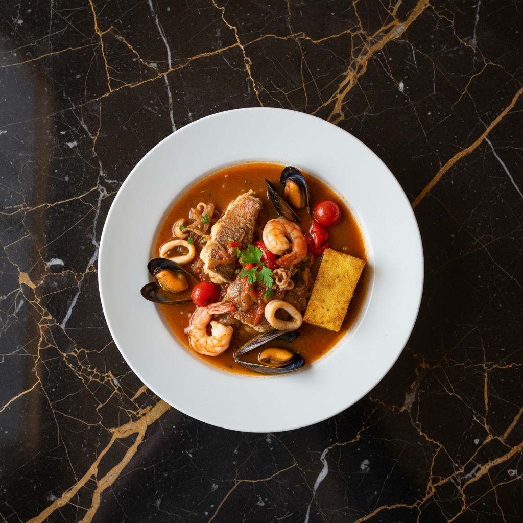 A hearty and flavorful fish stew, typical of coastal Italian regions but adapted in San Marino, featuring a rich tomato base with a variety of fresh fish and shellfish, seasoned with local herbs.