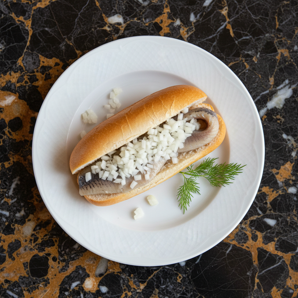 A quintessential Dutch street food, this dish features raw herring served in a soft bun with finely chopped raw onions.