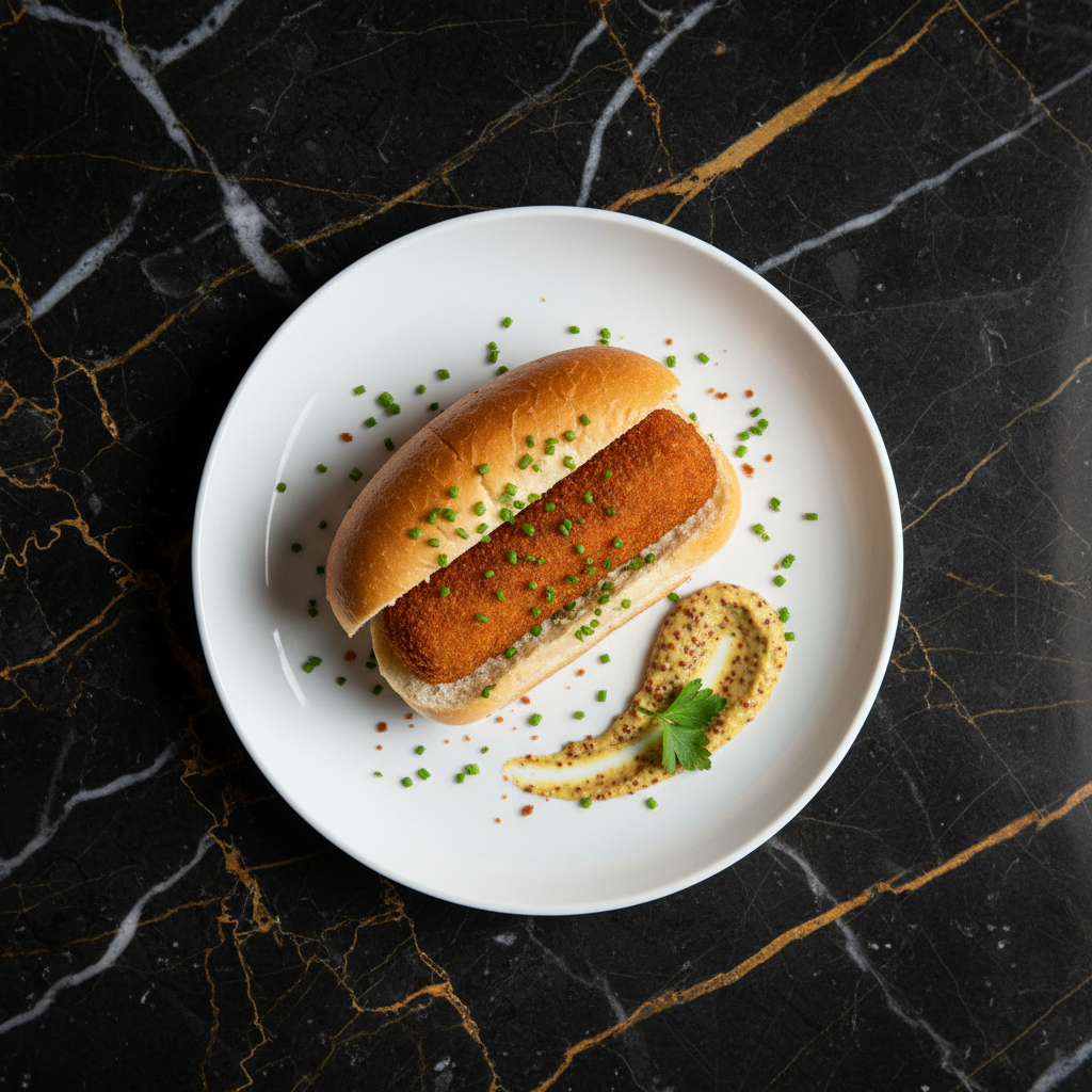A popular Dutch fast-food item, the Broodje Kroket features a deep-fried, breaded ragout (often beef or veal) served in a soft white bun, typically with mustard.