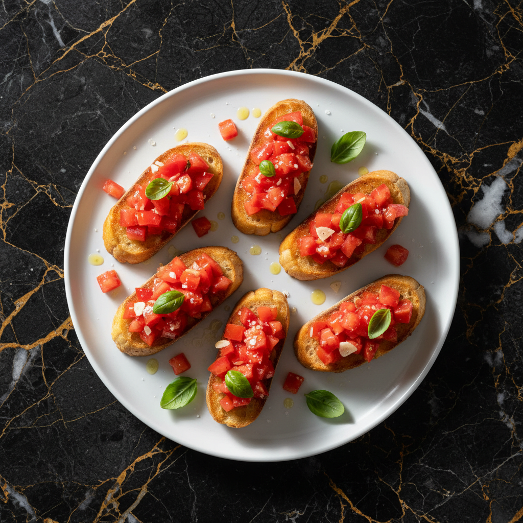 Classic Italian grilled bread rubbed with garlic and topped with a fresh, vibrant tomato and basil mixture. A perfect appetizer or light snack.