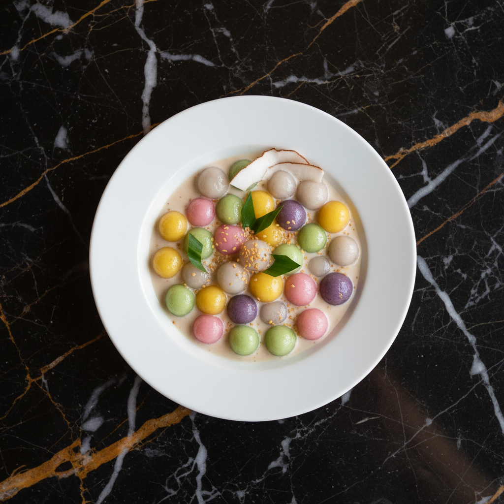 Bua Loi is a traditional Thai dessert featuring colorful, chewy glutinous rice balls gently floating in a fragrant, sweet coconut milk sauce. It's a delightful and visually appealing treat.