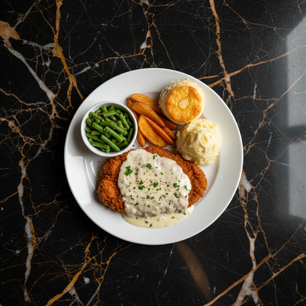 Tenderized cube steak, coated in a seasoned flour mixture and fried to a crispy golden brown, then smothered in a rich, creamy white gravy. A quintessential Southern comfort food.