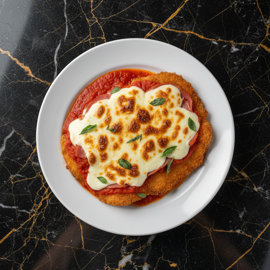 An iconic Australian pub classic: tender chicken schnitzel topped with rich Napoli sauce, savoury ham, and melted mozzarella cheese, baked to golden perfection.