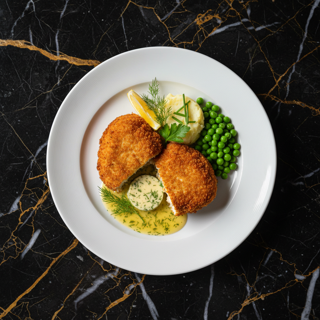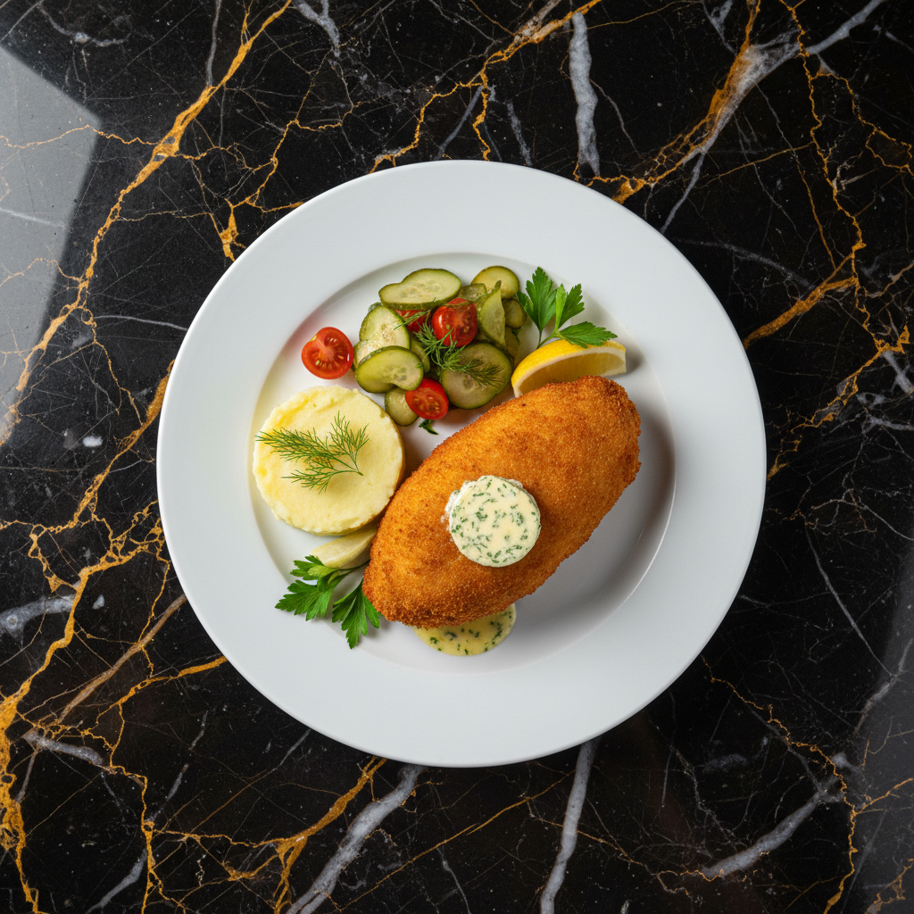 A classic Russian dish featuring tender chicken breasts pounded thin, filled with a luscious herb and garlic butter, then breaded and fried to a golden crisp. The signature molten butter center is a delightful surprise.