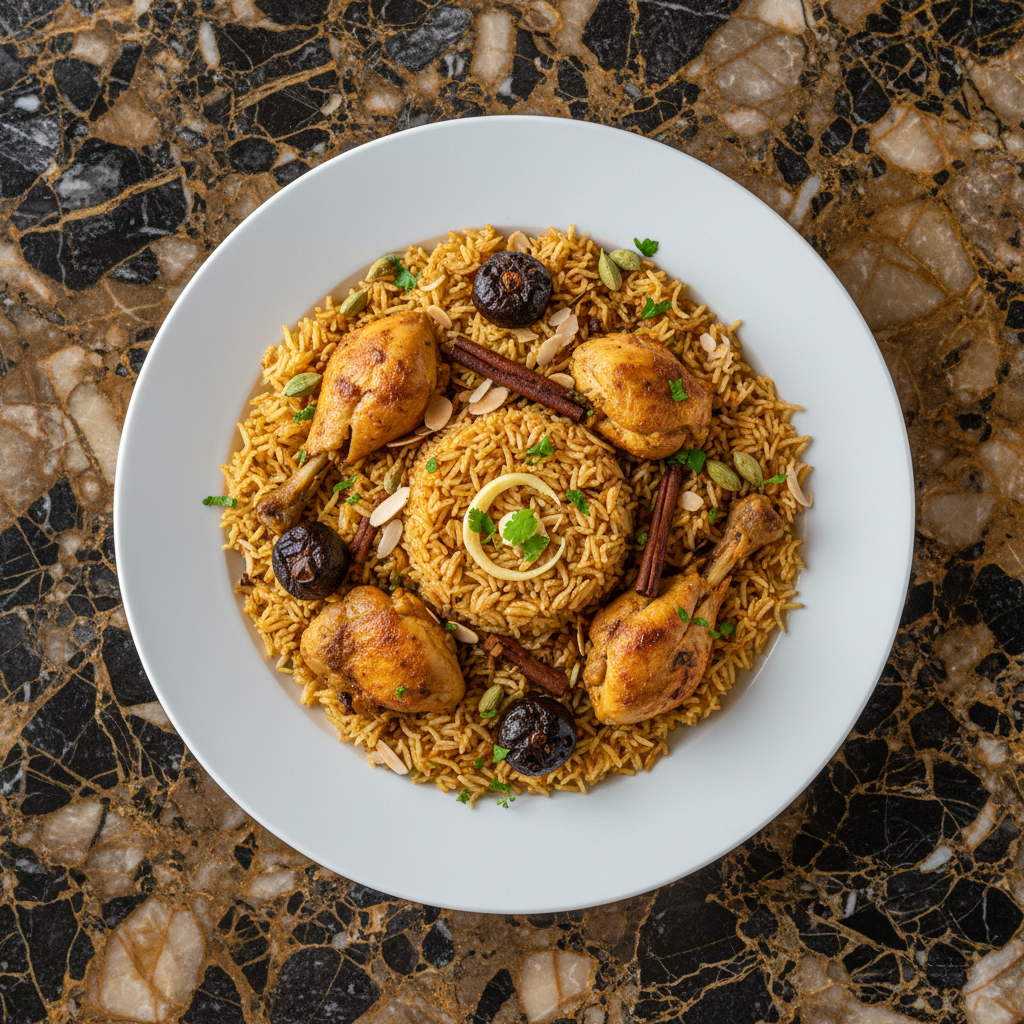 Chicken Machboos is a quintessential Emirati one-pot dish featuring fragrant basmati rice cooked with tender chicken pieces and a rich blend of aromatic spices. Key ingredients include dried lime (loomi), cardamom, cinnamon, and cloves, which impart a unique, warm flavor. Often considered a national dish, Machboos is a staple in Emirati households, perfect for family meals and celebrations.