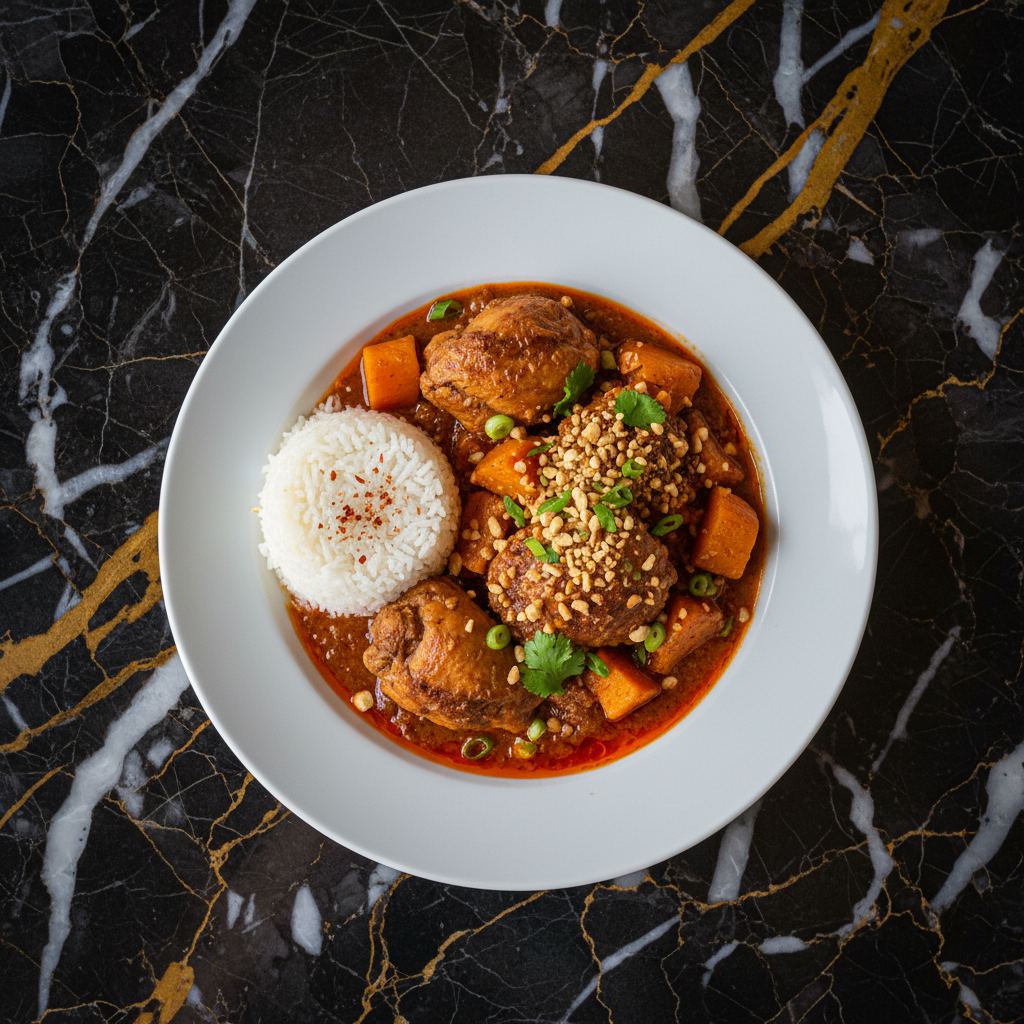 A rich and comforting West African-inspired stew featuring tender chicken, sweet potatoes, and a creamy peanut sauce. This dish is a flavorful representation of the region's love for peanut-based stews, often served with rice or tรด.