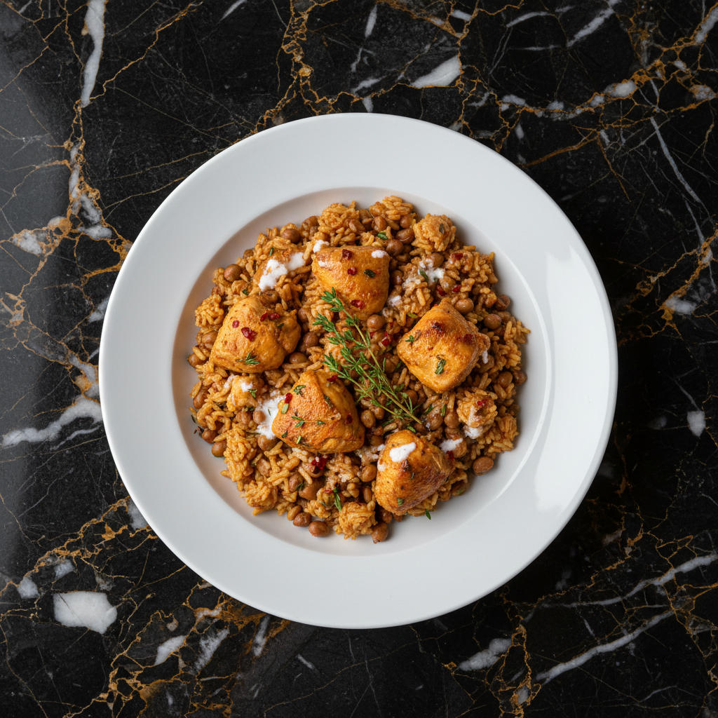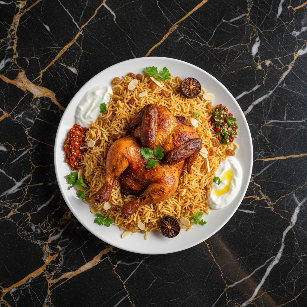 A traditional Yemeni and Saudi Arabian dish of rice and meat (usually chicken or lamb) cooked in a tandoor or special pit. The chicken is infused with smoky flavors and served with fragrant rice.