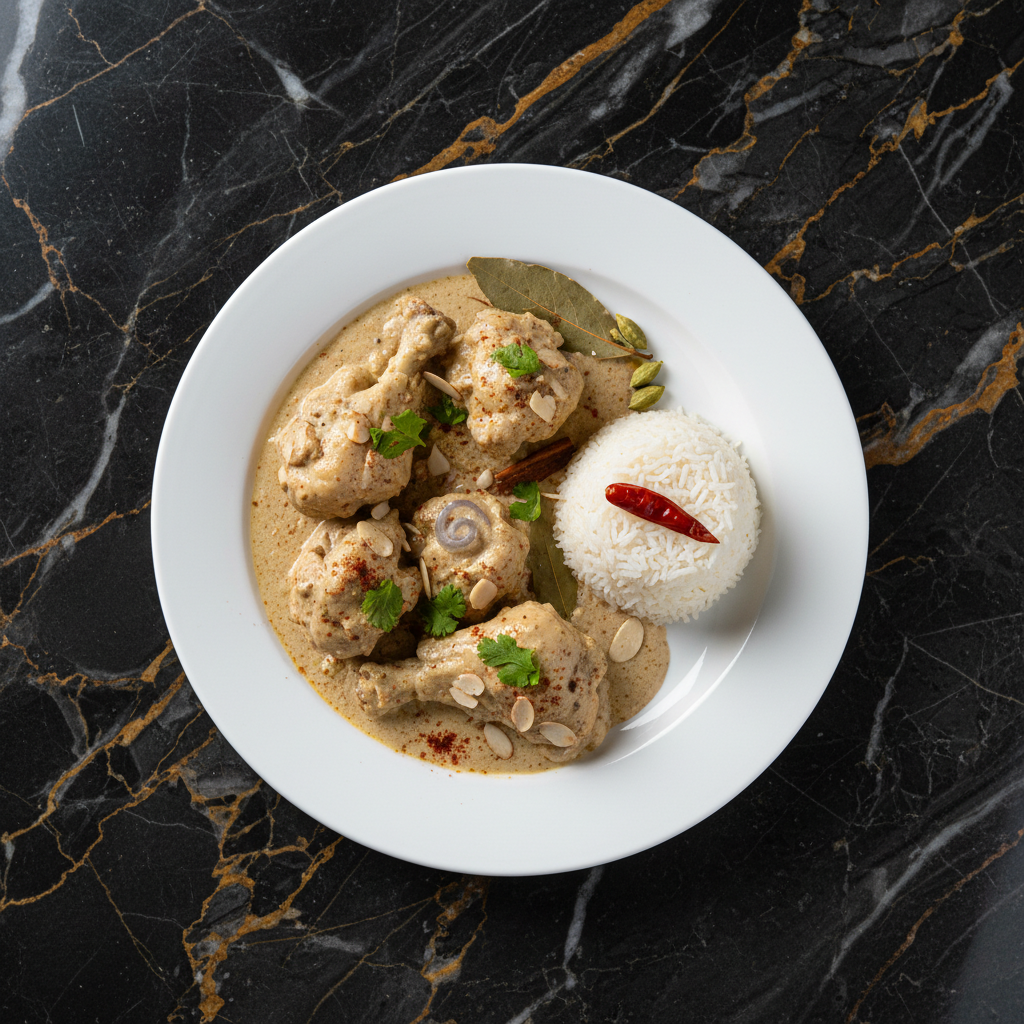 A rich and creamy Mughlai-inspired chicken curry, known for its delicate flavors and aromatic spices. It features tender chicken pieces simmered in a yogurt-based gravy with cashews, poppy seeds, and a hint of rose water.