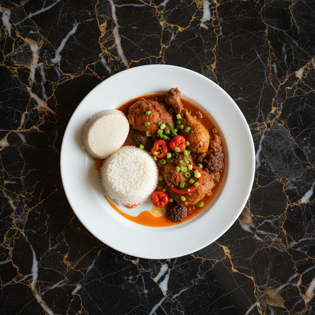 A flavorful and aromatic chicken stew featuring soumbala, a fermented locust bean condiment that imparts a unique umami depth. This dish is a staple in Burkinabe cuisine, often served with rice or tรด.