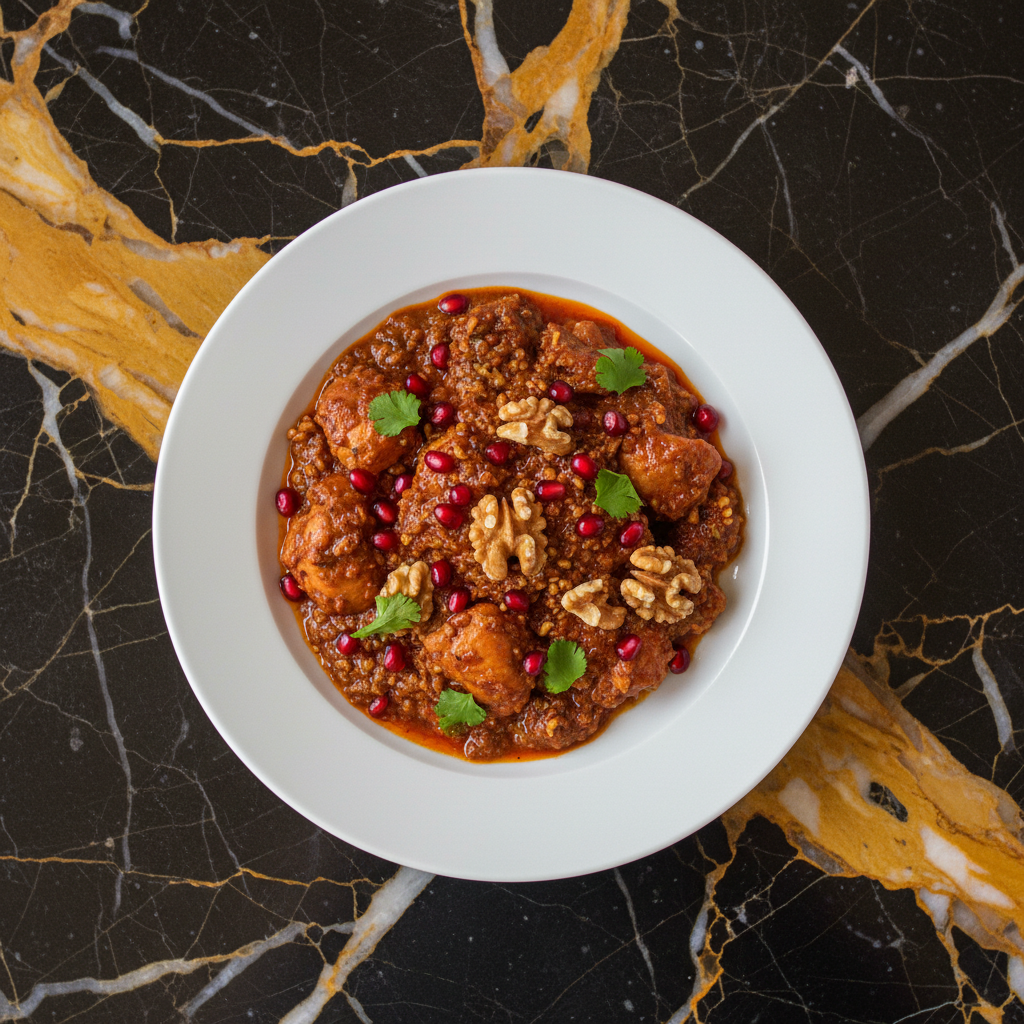 A rich and flavorful stew featuring tender chicken simmered in a unique sauce made from ground walnuts and pomegranate molasses. This dish, inspired by Persian and Armenian culinary traditions, offers a delightful balance of sweet, tart, and savory notes.