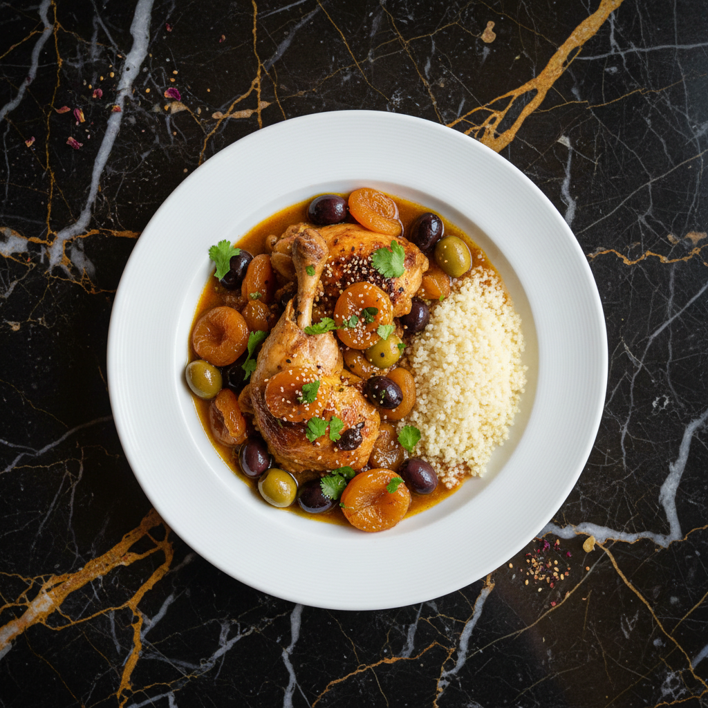 A fragrant and flavorful chicken tagine featuring tender chicken pieces simmered in a rich sauce with sweet apricots, briny olives, and a blend of aromatic spices. This dish offers a delightful balance of sweet, savory, and tangy notes, often served with couscous.