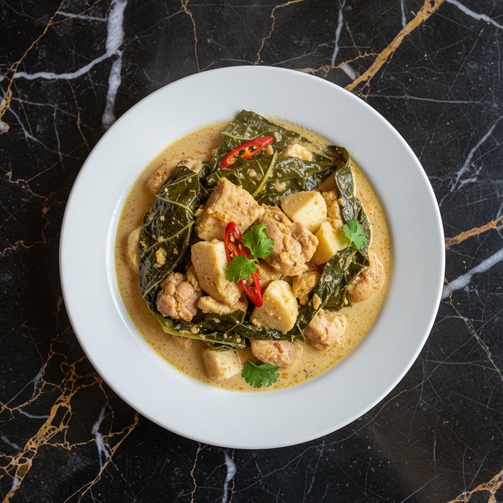 A rich and savory dish featuring tender chicken simmered in coconut cream with taro leaves, onions, and garlic. This dish is a comforting staple, often prepared for family gatherings and special occasions.