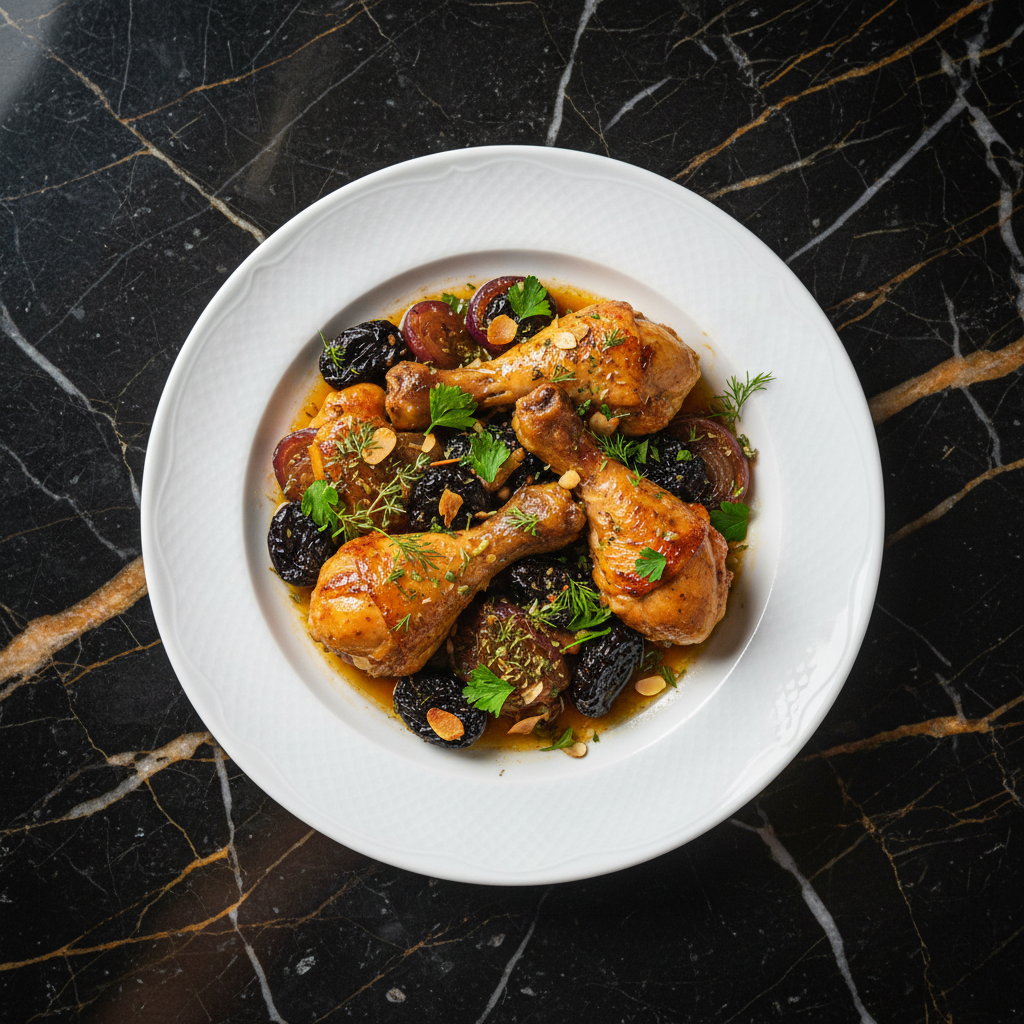 A comforting and aromatic Bulgarian dish where tender chicken pieces are braised with sweet plums, onions, and a blend of savory herbs, creating a delightful balance of sweet, savory, and slightly tart flavors.