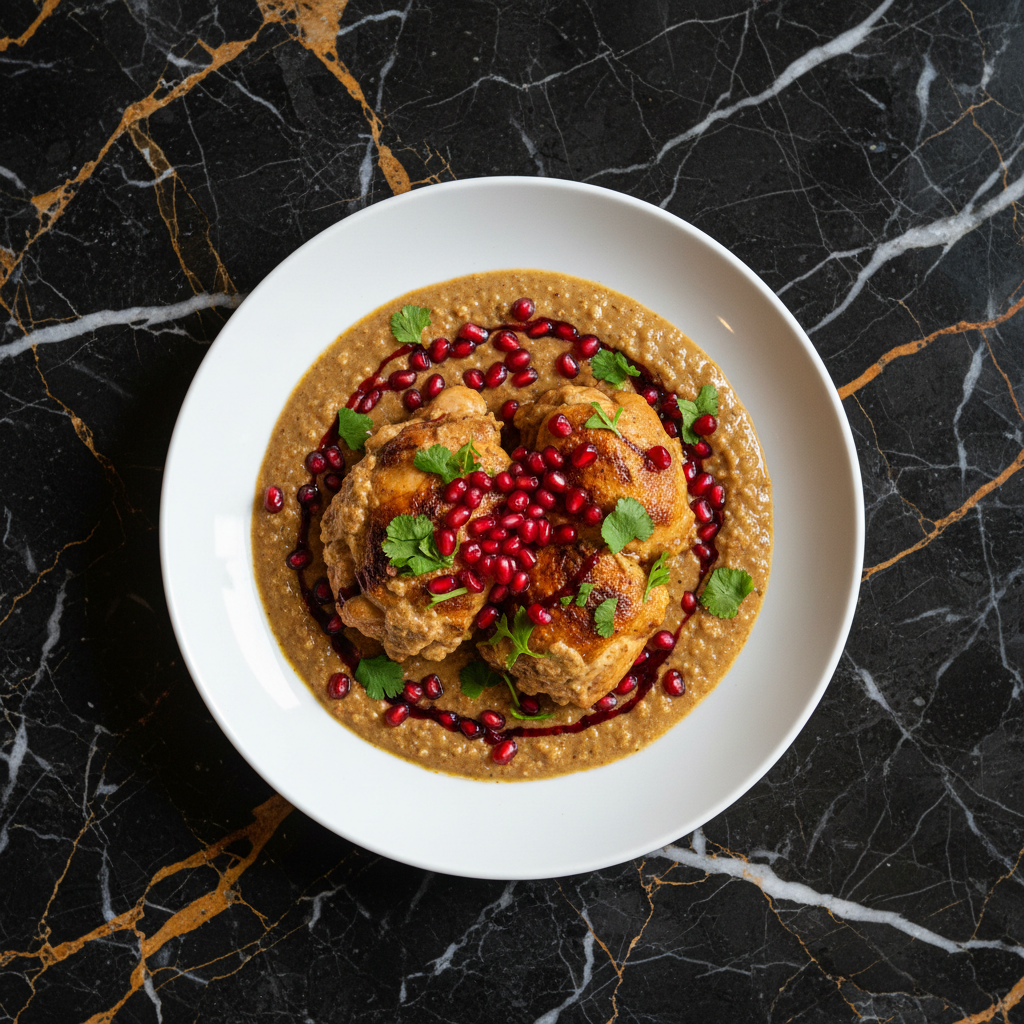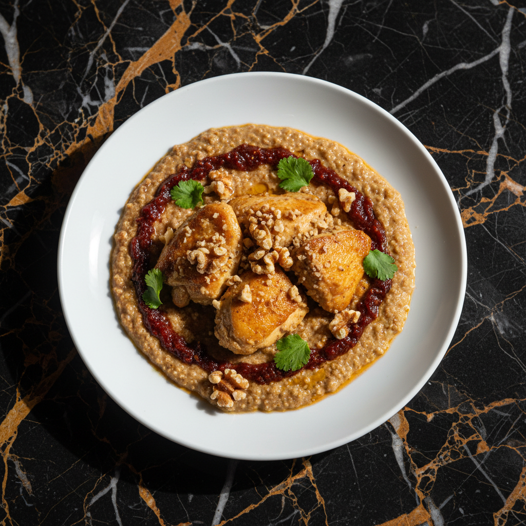 A rich and flavorful Georgian dish featuring tender chicken simmered in a creamy sauce made from ground walnuts, pomegranate molasses, and aromatic spices. This dish balances sweet, tart, and savory notes, often garnished with fresh pomegranate seeds and herbs.