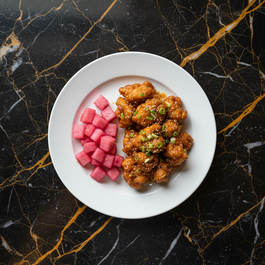 Crisp, refreshing, and slightly sweet-tart pickled daikon radish cubes, a classic accompaniment to Korean fried chicken, offering a delightful contrast to the richness of the fried dish.