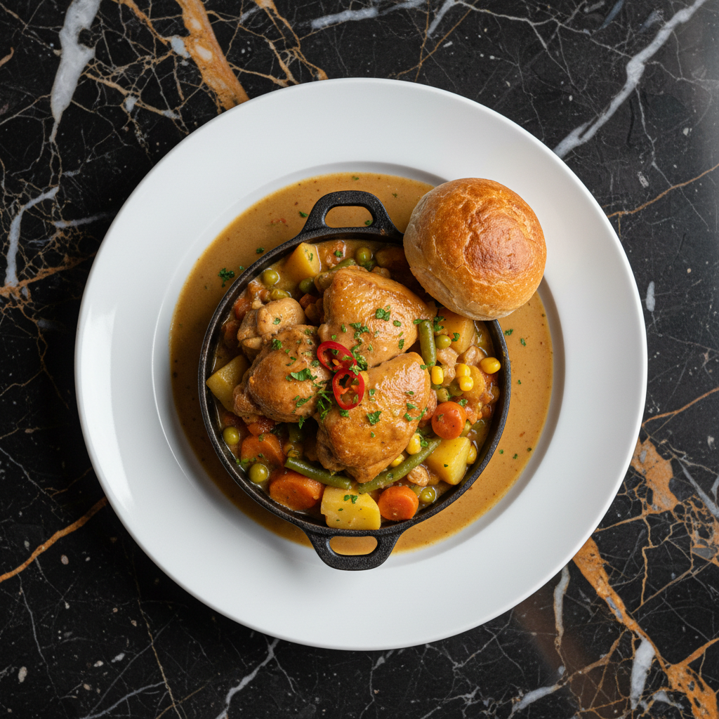 A hearty and flavorful South African chicken stew cooked in a traditional potjie pot, offering a lighter yet equally delicious alternative to red meat versions.