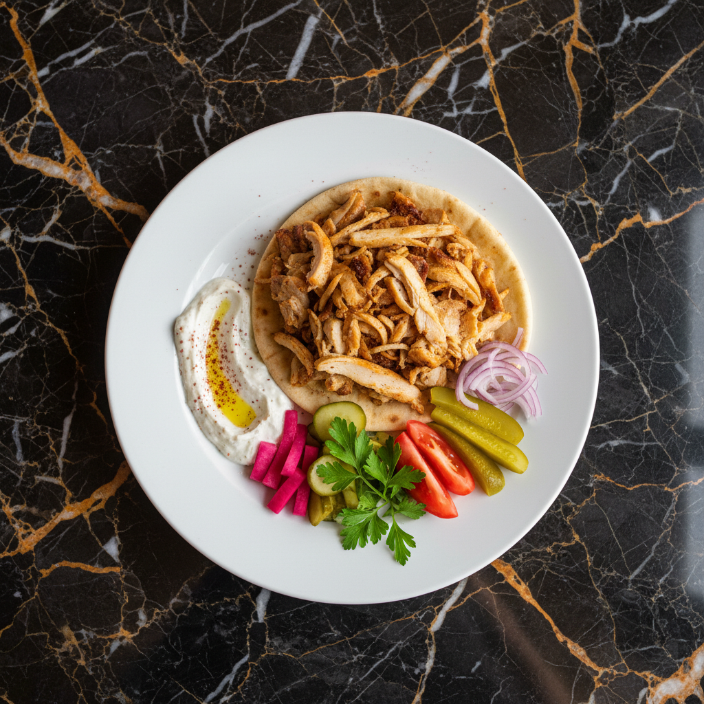 Tender, marinated chicken thighs roasted to perfection and shaved thin, served in warm pita bread with creamy toum (garlic sauce), tangy pickles, and fresh vegetables. This recipe recreates the essence of traditional Middle Eastern rotating spit-roasted meat at home.