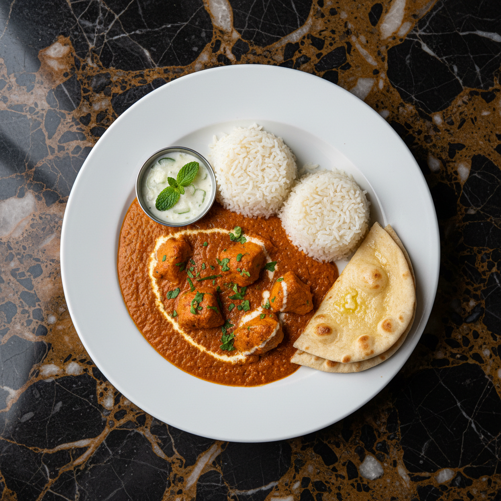 A beloved British Indian curry featuring tender, marinated chicken pieces simmered in a rich, creamy, and spiced tomato sauce. Often considered Britain's national dish.