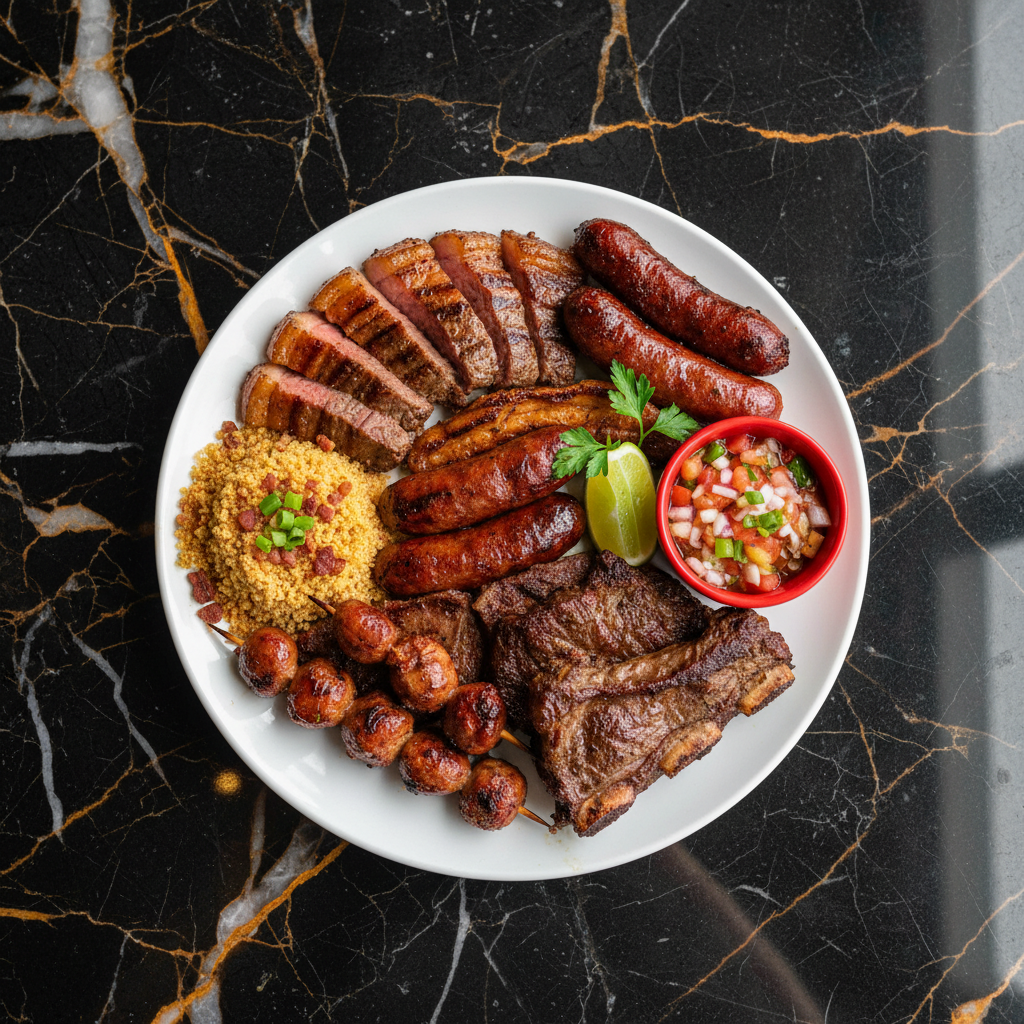 Authentic Brazilian Churrasco, a celebratory feast featuring various cuts of meat grilled over charcoal on long skewers, served rodรญzio style. This method emphasizes the natural flavor of the high-quality meats, seasoned simply with coarse salt.