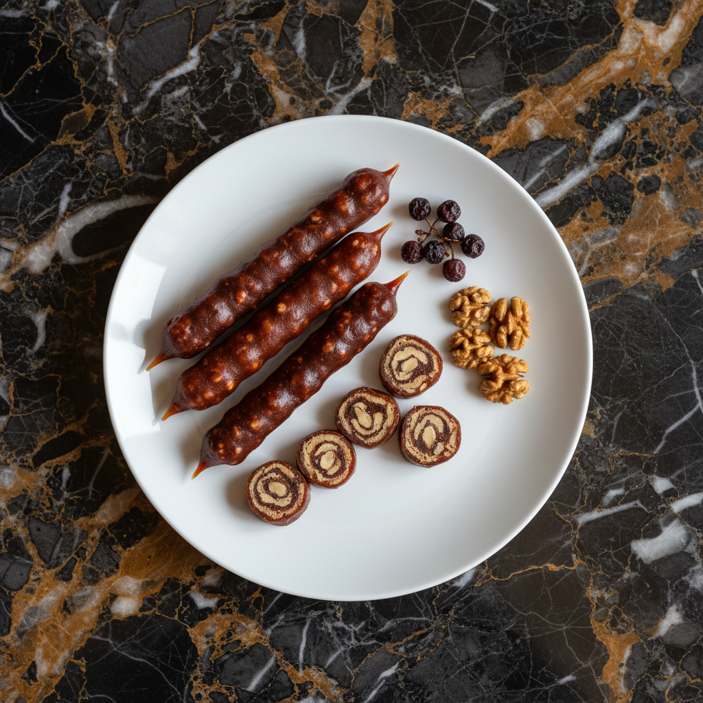 A traditional Georgian candle-shaped candy made by repeatedly dipping strings of walnuts into a thickened mixture of grape juice and flour (tatara). It's a healthy and naturally sweet treat, often enjoyed during holidays.