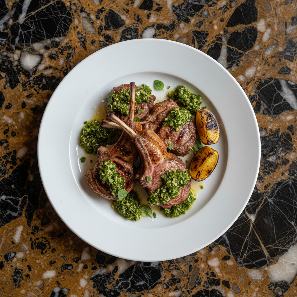 A flavorful Uruguayan-style grilled lamb, marinated and served with a vibrant, herbaceous chimichurri sauce. This dish highlights the quality of Uruguayan lamb and the popular South American condiment.
