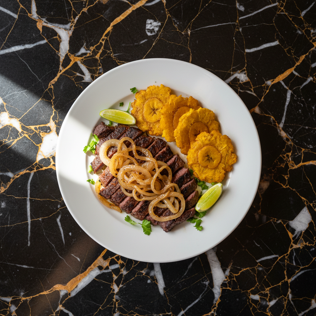 Dominican grilled steak - tender skirt steak marinated in a vibrant blend of sour orange, garlic, and oregano, grilled to perfection, and generously topped with sweet, caramelized onions. Traditionally served with tostones (fried plantains).