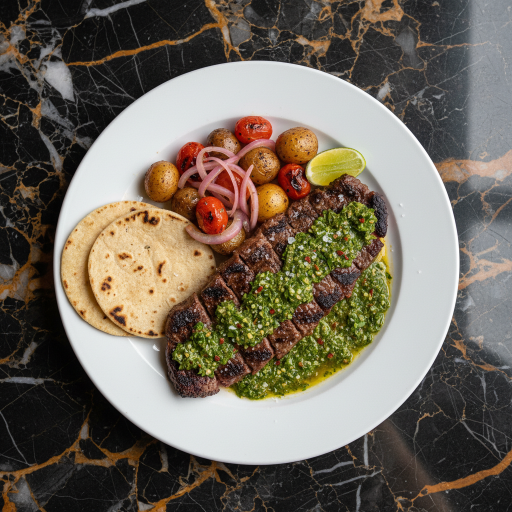 A flavorful grilled steak dish, often served with a vibrant and herbaceous chimichurri sauce, representing a popular way of enjoying grilled meats in Guatemala, influenced by South American traditions but with local adaptations.
