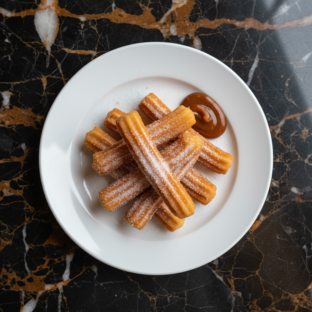 Crispy, ridged fried dough sticks, generously coated in a warm cinnamon-sugar mixture. Traditionally served with a rich, spiced Mexican chocolate for dipping, these churros are a delightful sweet treat.