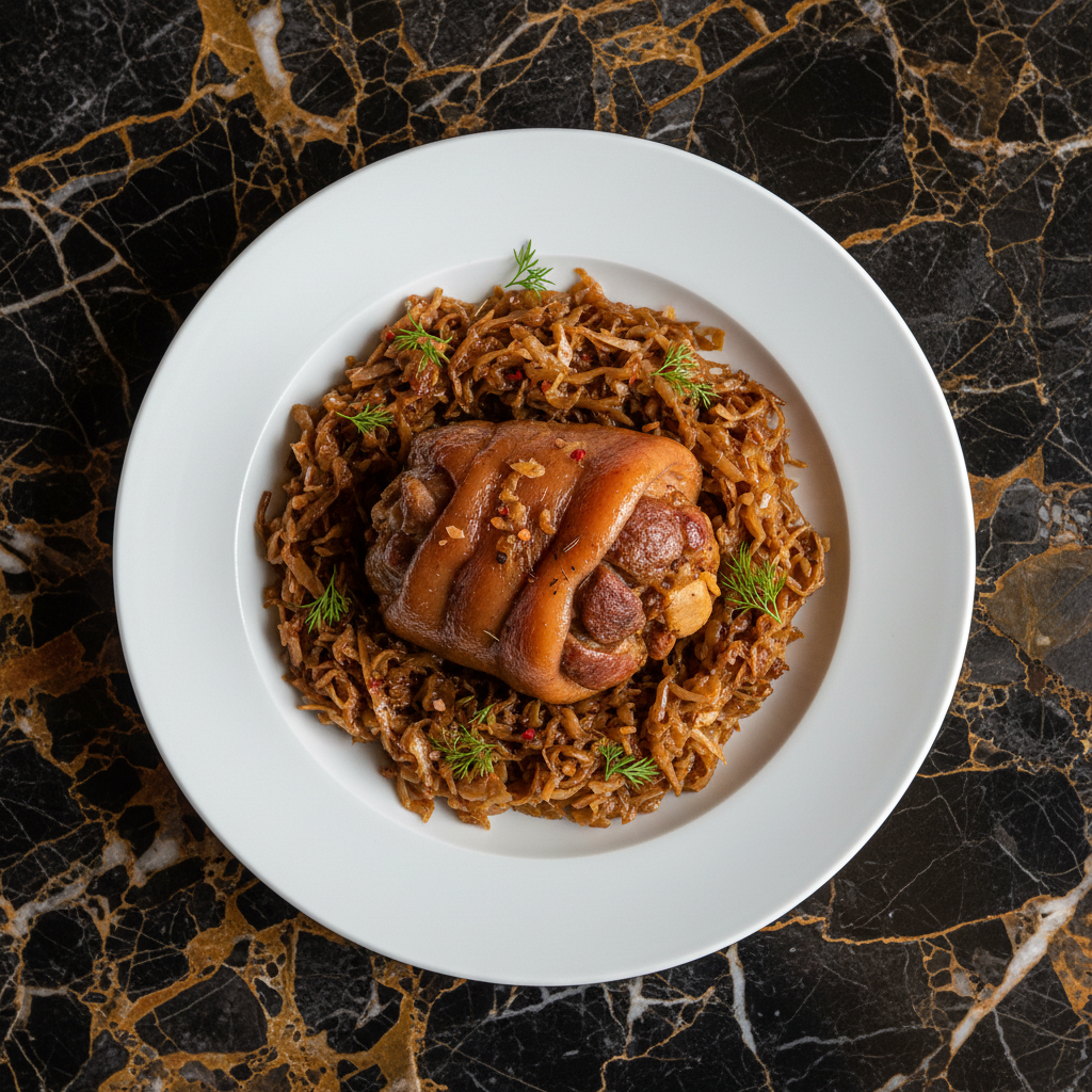 A hearty and comforting Romanian dish featuring slow-braised pork knuckle served over a bed of sweet and savory braised cabbage. The pork becomes incredibly tender, and its juices infuse the cabbage, creating a rich and flavorful meal.