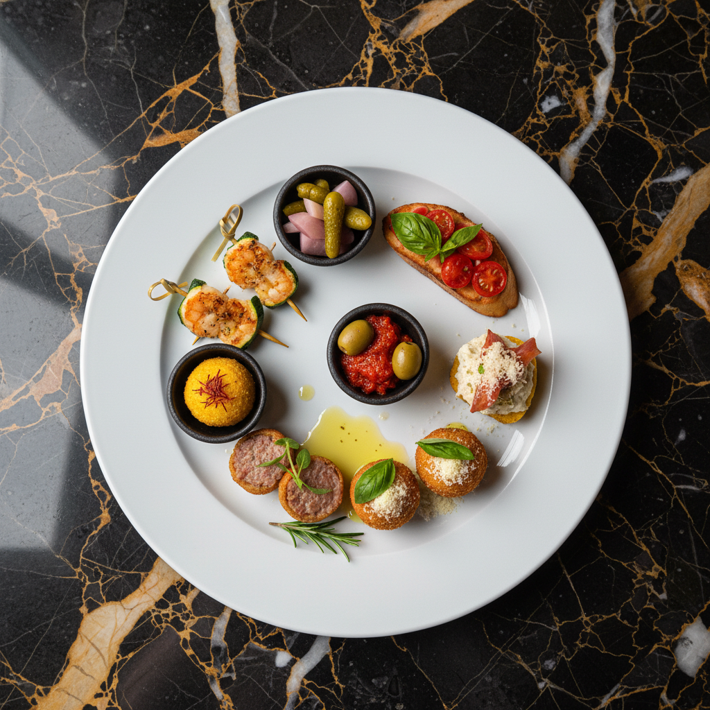 Venetian small plates - bite-sized snacks, akin to tapas, traditionally served at bร cari (wine bars) with a small glass of wine (ombra).