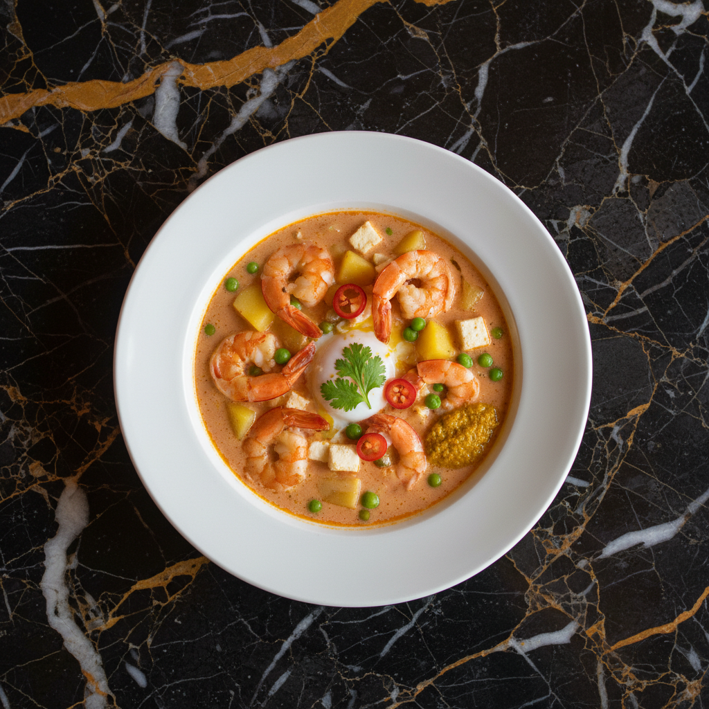 A rich and creamy Peruvian shrimp chowder, a beloved specialty from Arequipa. This hearty soup features tender river shrimp, soft potatoes, and a velvety broth enriched with evaporated milk and cheese, finished with a perfectly poached egg.