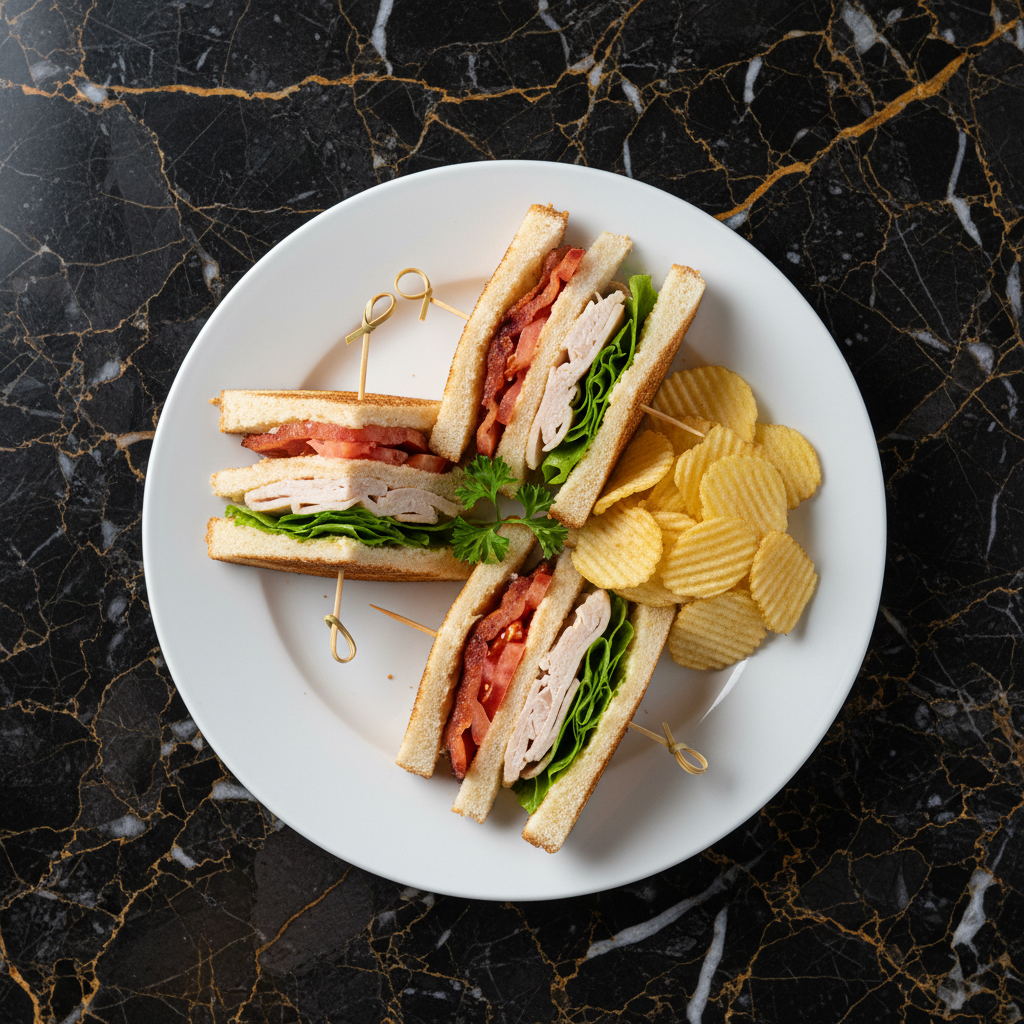 A quintessential triple-decker sandwich featuring layers of tender turkey, crispy bacon, fresh lettuce, and juicy tomato, all nestled between perfectly toasted bread and slathered with creamy mayonnaise. Originally invented at the Saratoga Club.