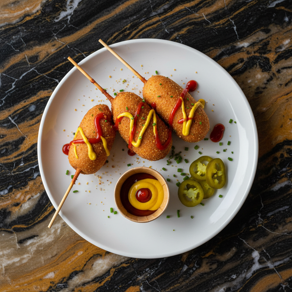 Iconic American street food featuring hot dogs coated in a crispy, golden cornmeal batter and deep-fried to perfection. A quintessential fair food experience.