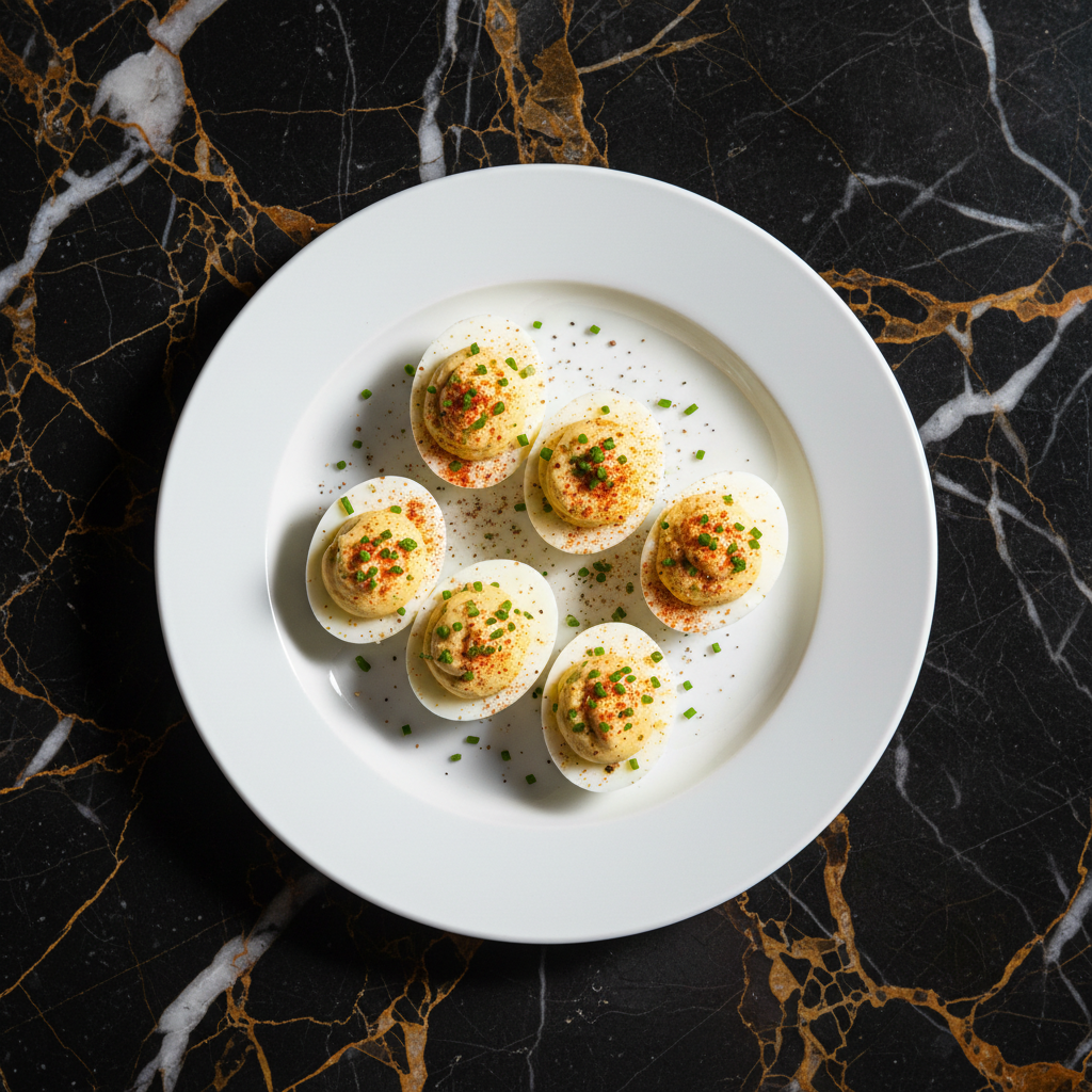 A quintessential American potluck favorite, these deviled eggs feature perfectly hard-boiled eggs halved and filled with a rich, creamy yolk mixture, finished with a sprinkle of paprika and fresh chives.