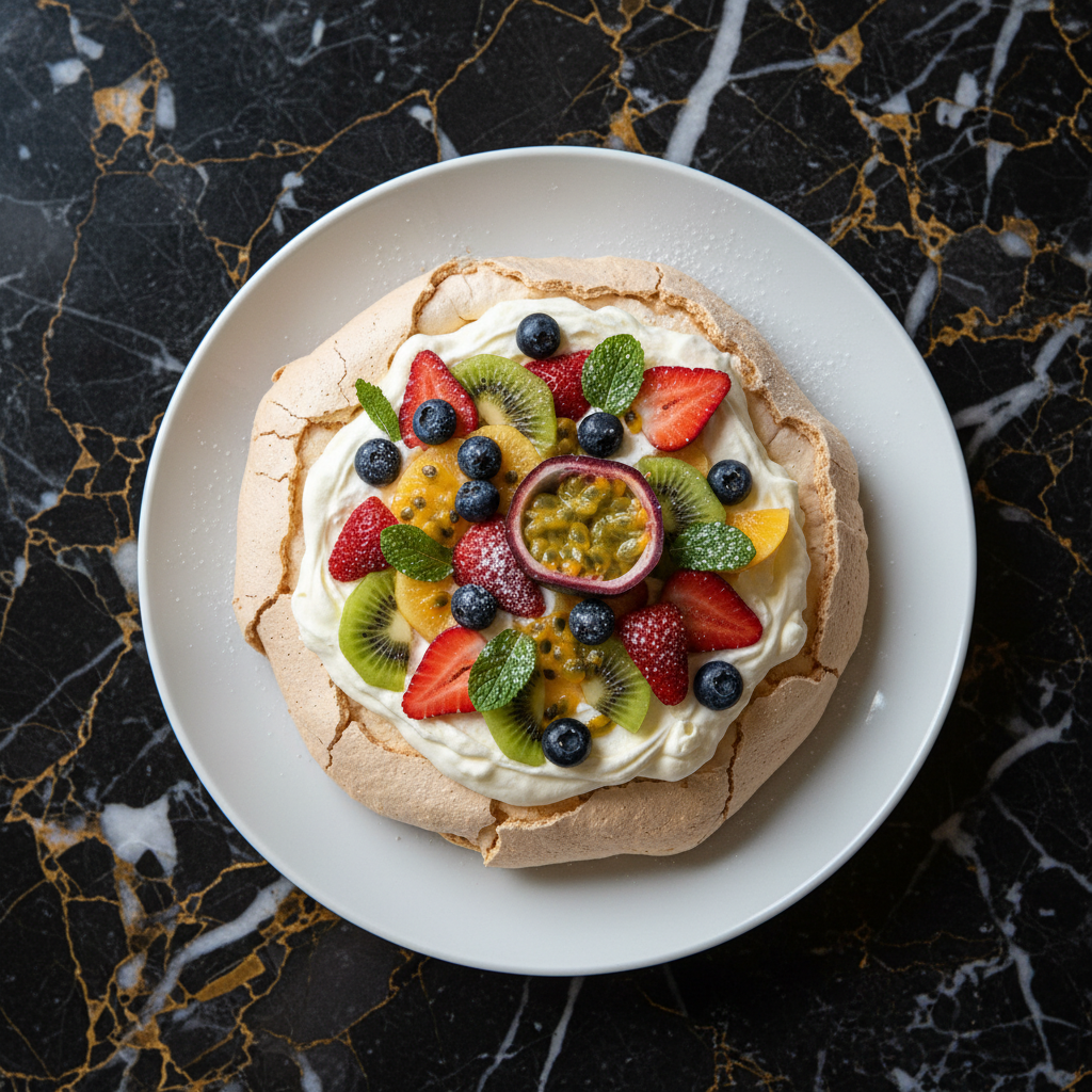 A beloved Australian icon, this pavlova features a crisp, golden meringue shell with a delightfully soft, marshmallow-like center. It's generously topped with whipped cream and a vibrant medley of fresh fruits, making it a perfect centerpiece for any celebration.