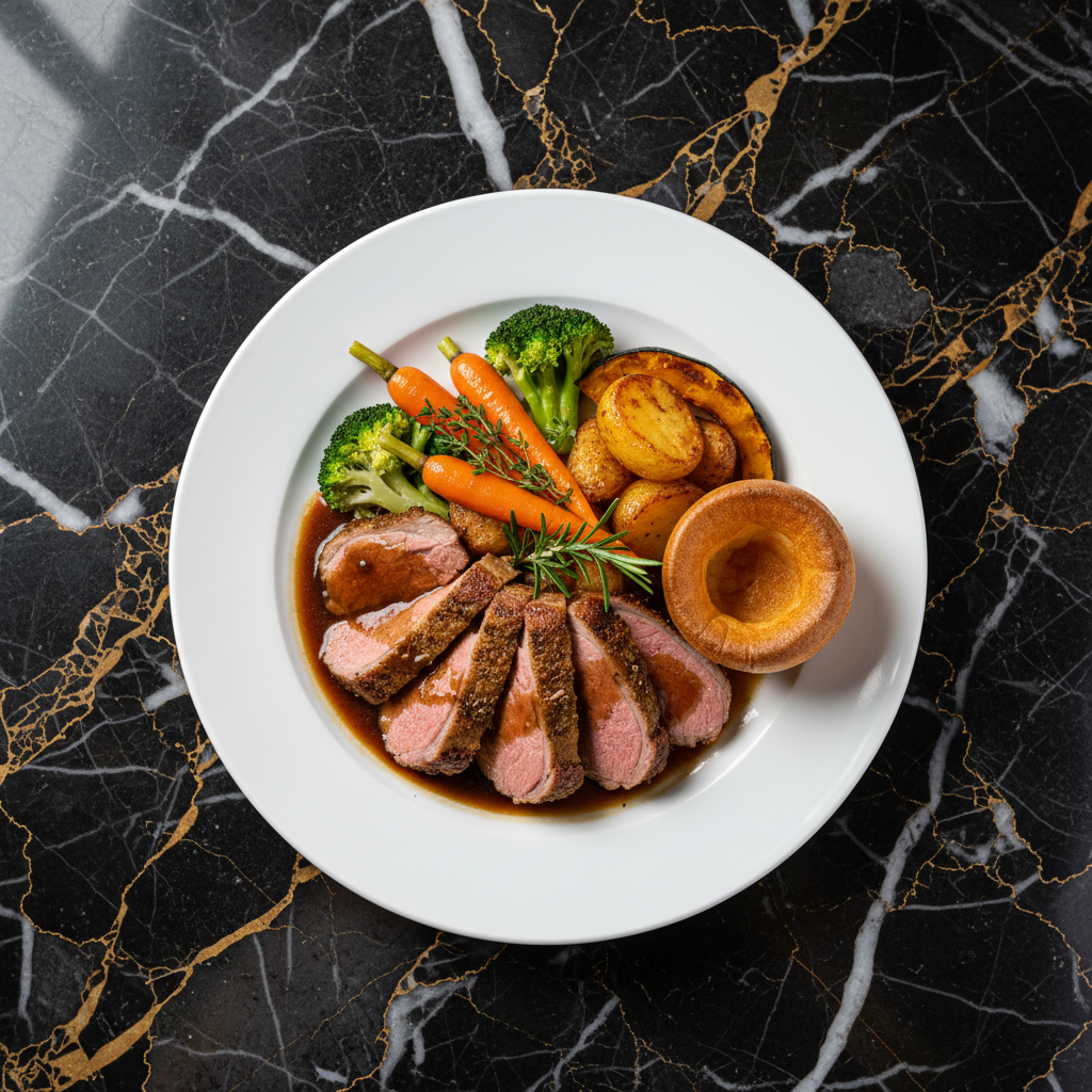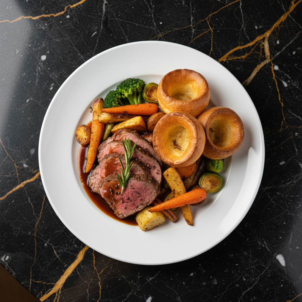 A quintessential British Sunday Roast featuring a perfectly roasted joint of beef, crispy roast potatoes, seasonal vegetables, and fluffy Yorkshire puddings, all brought together with rich gravy. A comforting and traditional meal perfect for family gatherings.